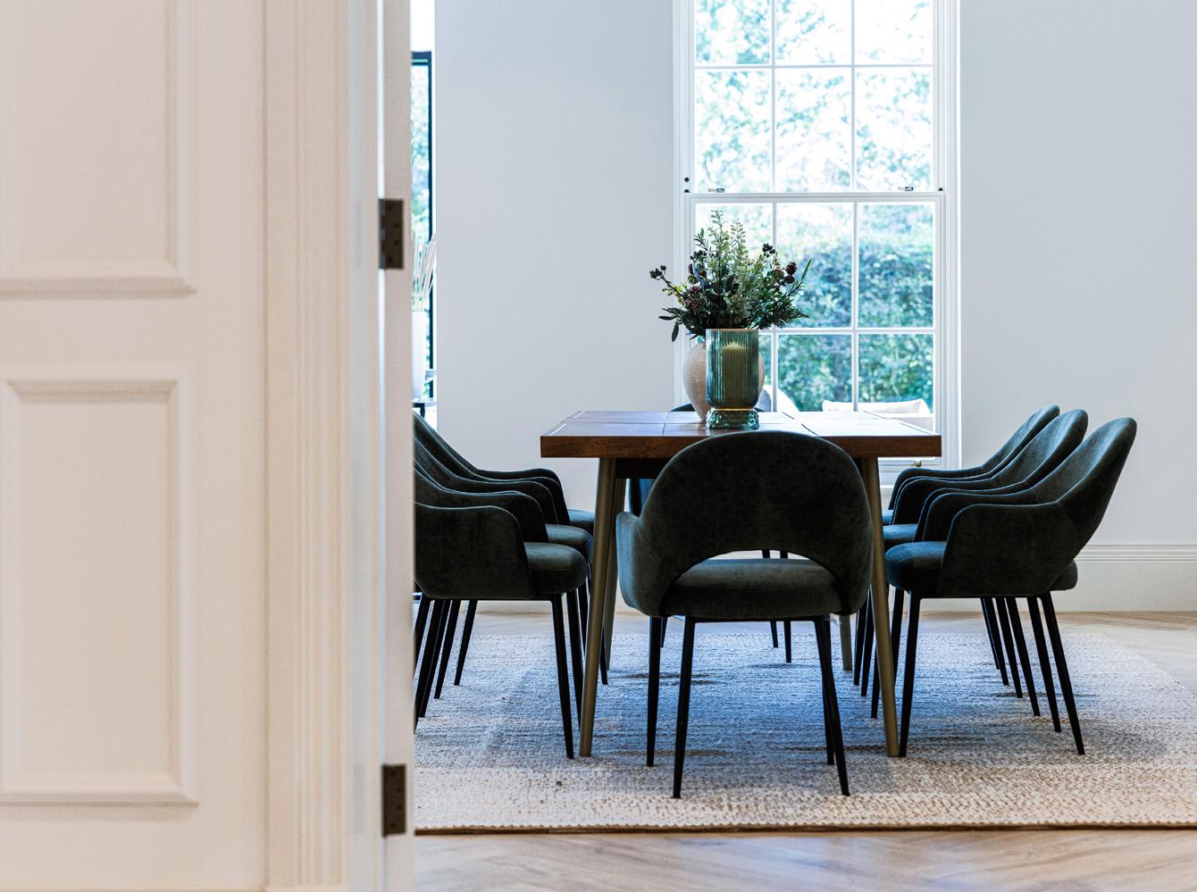 The rear of the home opens gracefully into a stunning and expansive open-plan kitchen and living space, thoughtfully designed for both everyday family life and effortless entertaining. This modern culinary hub is fitted with topof-the-line Miele appliances, sleek cabinetry, and elegant stone countertops, making it as functional as it is visually striking. This harmonious connection to nature creates a sense of calm and openness throughout. Completing this impressive ground floor is a stylish cloakroom and a highly practical utility room, which includes direct internal access to the integrated garage—ideal for busy households and keeping day-to-day living organised and efficient.