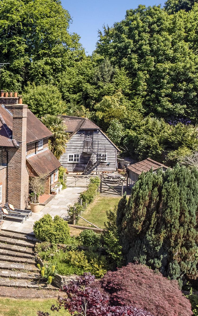 Peppered with extensive terracing, a series of cascading ornamental ponds and beautifully planted borders, the south facing gardens of the Cotton House combine with the scenery of the Surrey Hills countryside to conjure a breathtakingly idyllic backdrop to this immaculate home.