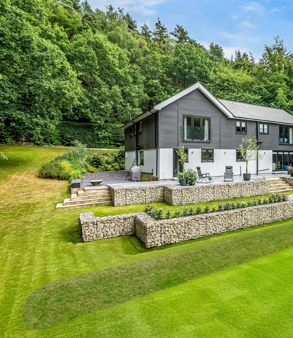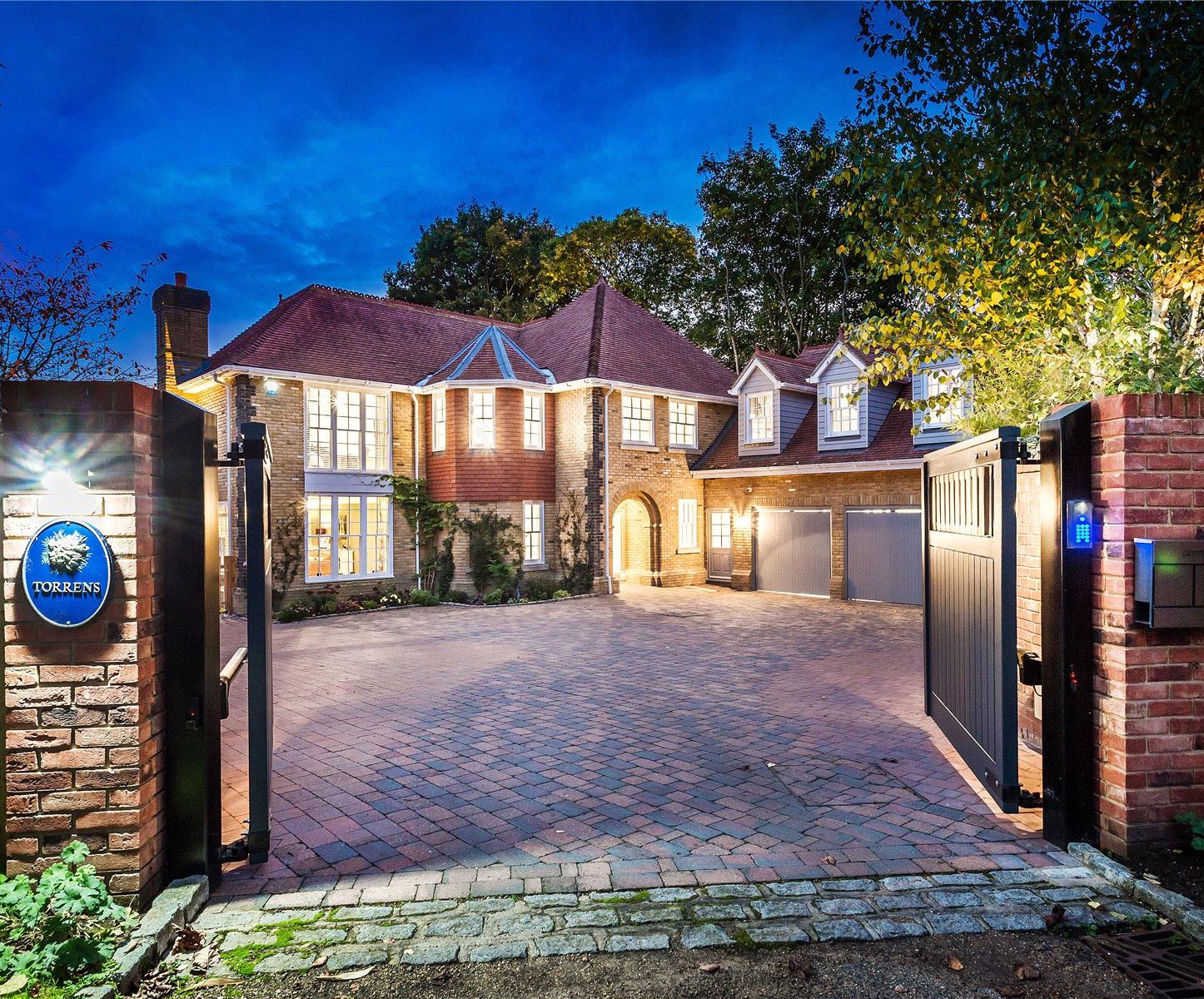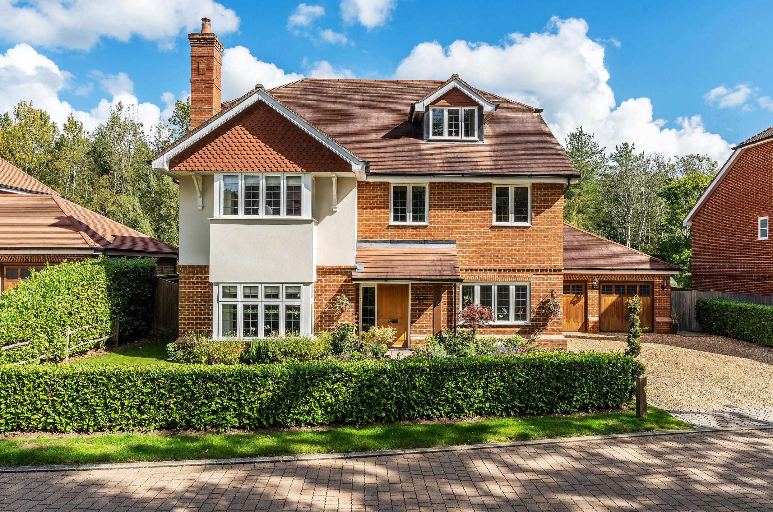 An individual, executive four-bedroom family home built to an exacting standard of just under 5000sq ft, and renovated to the highest of standards, set in a small exclusive gated private estate at the end of a quiet wooded lane. The house borders Chobham Common National Nature Reserve, a designated area of outstanding natural beauty