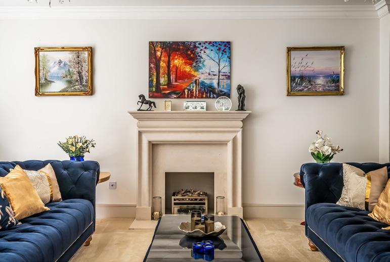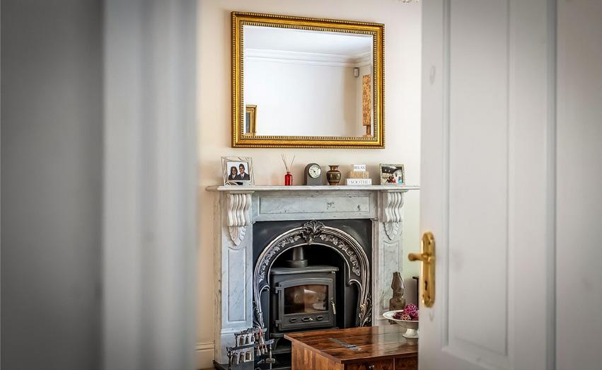 The principal reception rooms are thoughtfully arranged around this central space, including an opulent formal drawing room, an elegant dining room, and a comfortable sitting room—each graced with its own distinctive fireplace, adding both warmth and character. The lift, discreetly positioned within the hall, provides effortless access to the first floor, where the accommodation continues to impress.