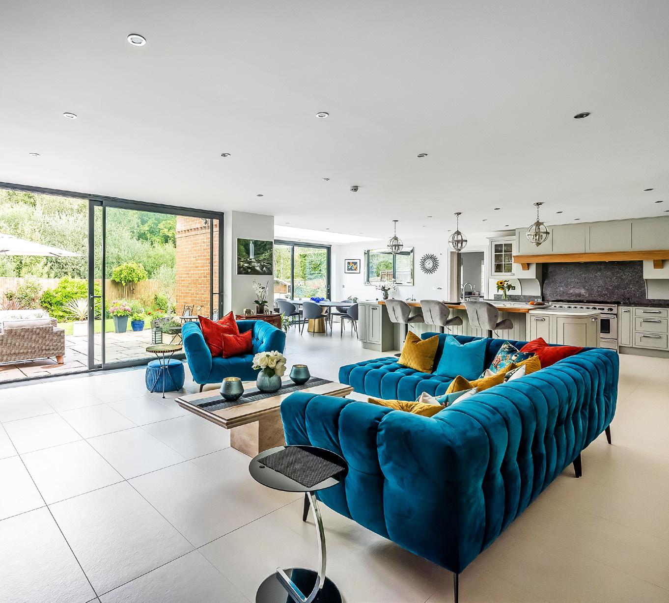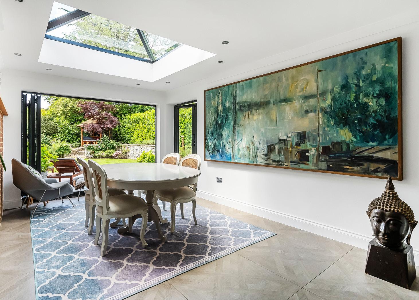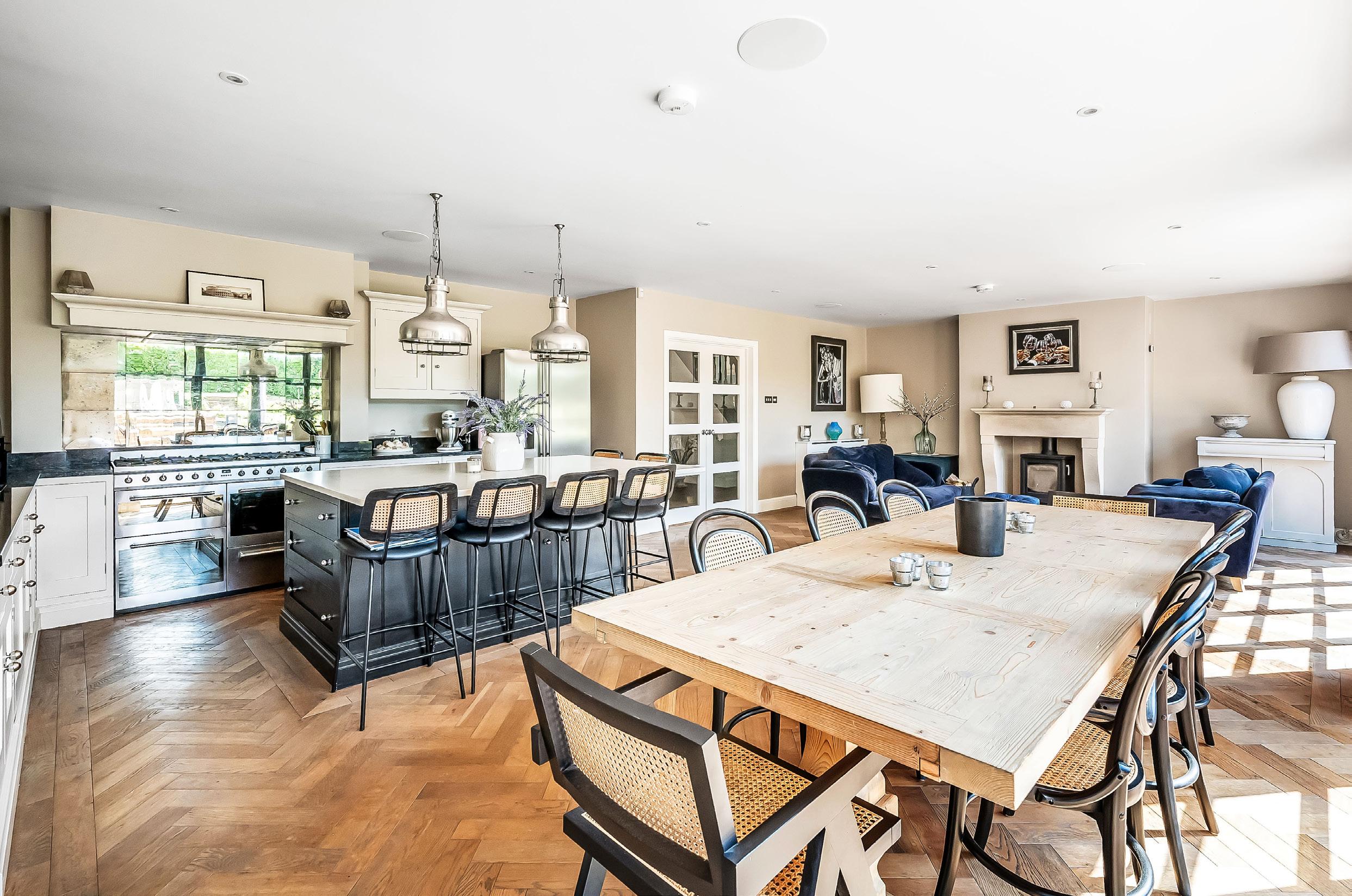 Seamlessly, the space flows into a spacious dining area that easily accommodates large family meals or lively dinner parties. Beyond, the relaxed living zone offers a welcoming environment with views across the garden, creating a calm and sociable atmosphere at the very centre of the home.