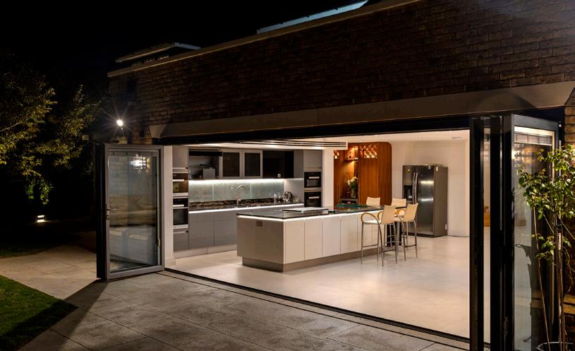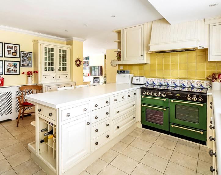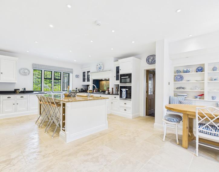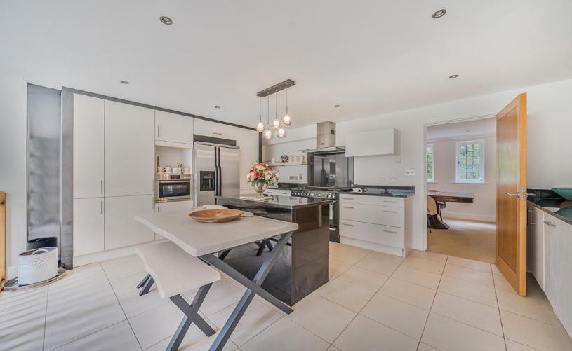 Handmade painted cabinetry sits alongside striking granite work surfaces, while a full range of integrated appliances ensures practicality without compromising on elegance. Whether it be casual family meals, relaxed Sunday mornings, or more formal gatherings, this room provides a flexible and inspiring environment. Vast floorto-ceiling sliding doors open onto a generous terrace, creating a seamless link between the indoors and the professionally landscaped gardens, ensuring that outdoor living is as effortless as it is inviting.