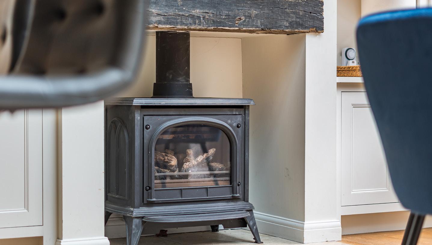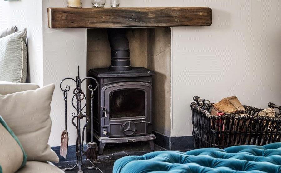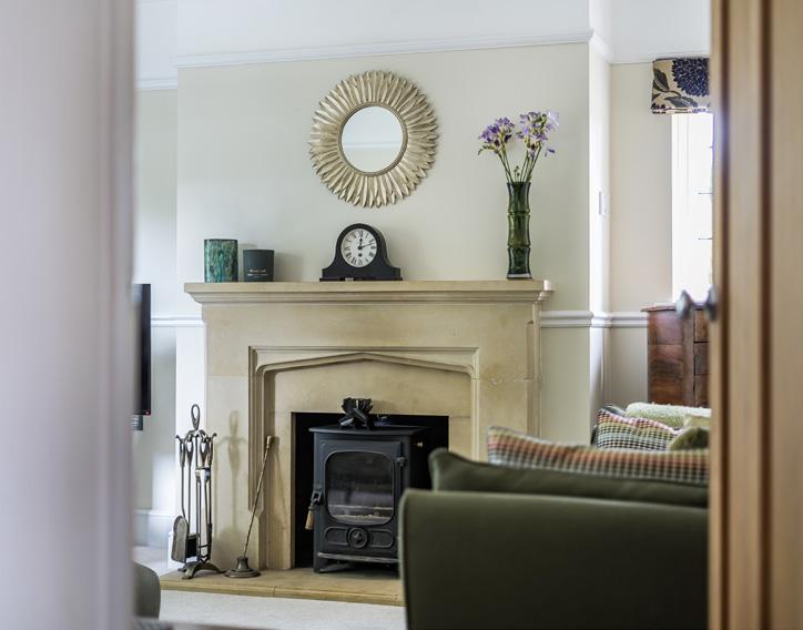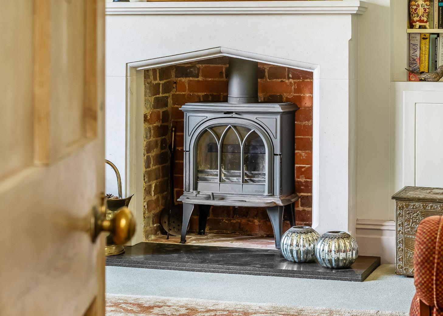 Bay windows look out onto the white hydrangeas, and whilst beautifully crafted cabinetry nestles within wide chimney breast alcoves, a first class wood burner sits within the fireplace framed by a refined stone mantelpiece.