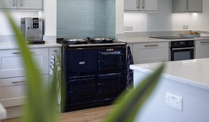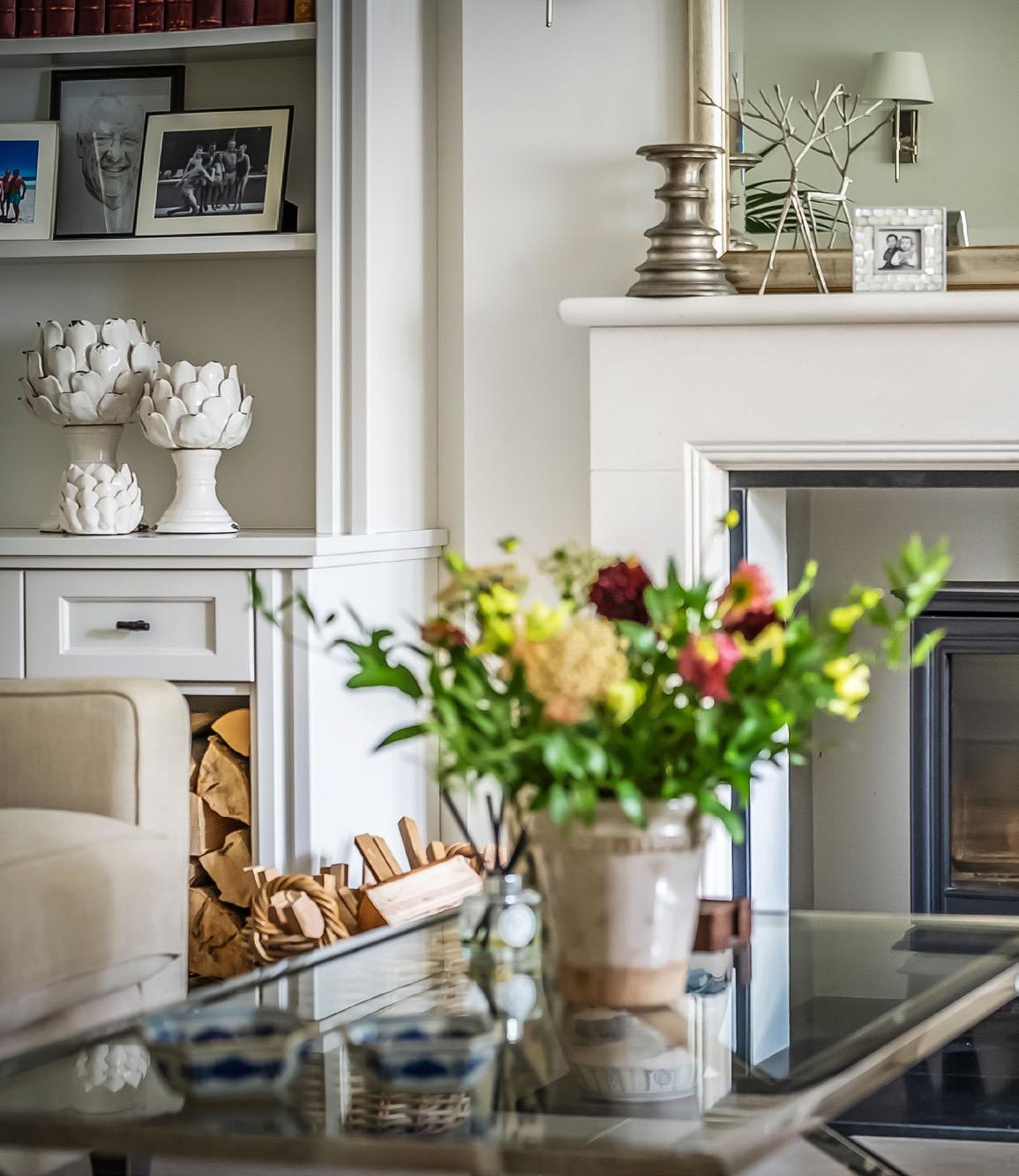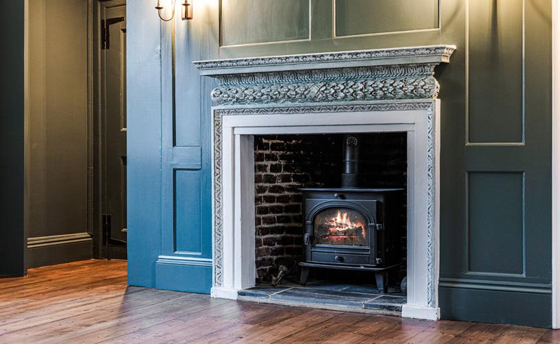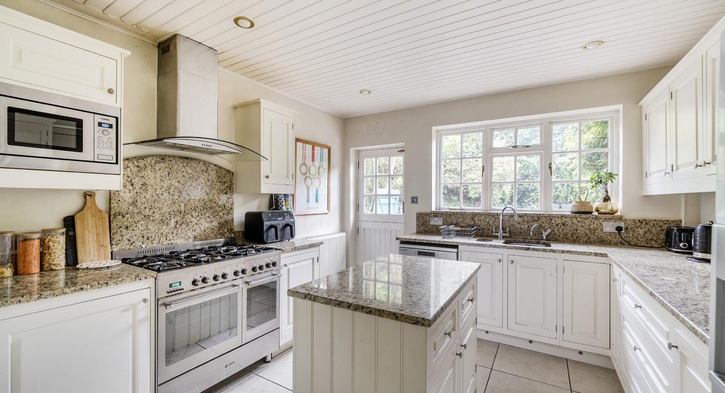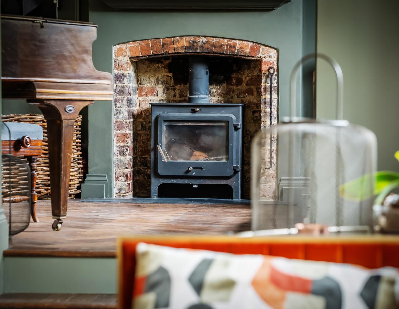 Bay windows look out onto the white hydrangeas, and whilst beautifully crafted cabinetry nestles within wide chimney breast alcoves, a first class wood burner sits within the fireplace framed by a refined stone mantelpiece.