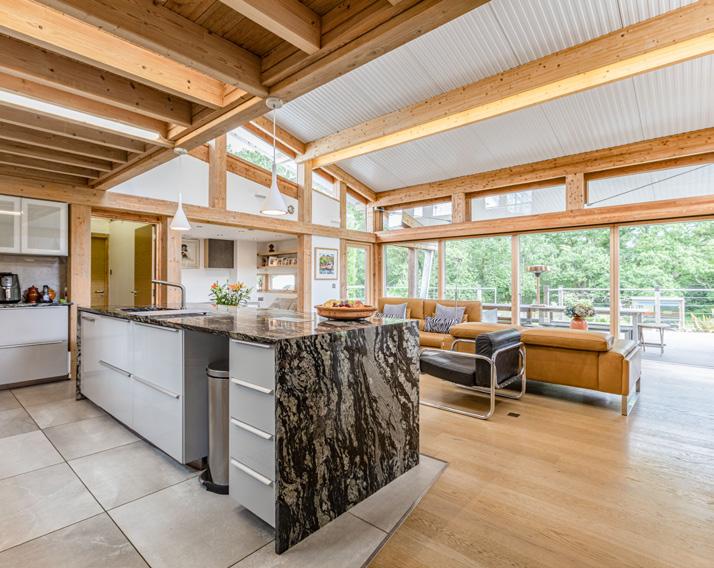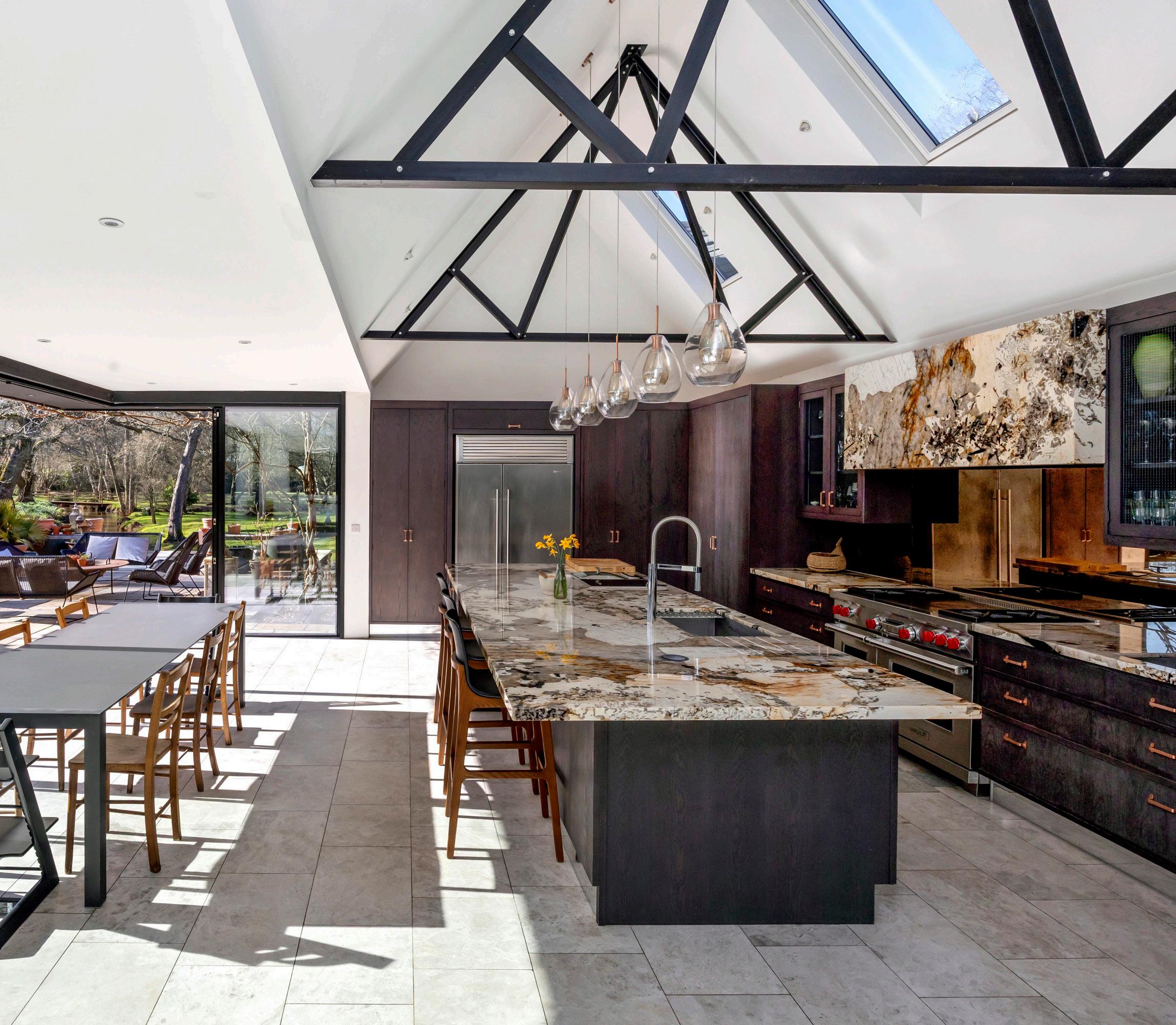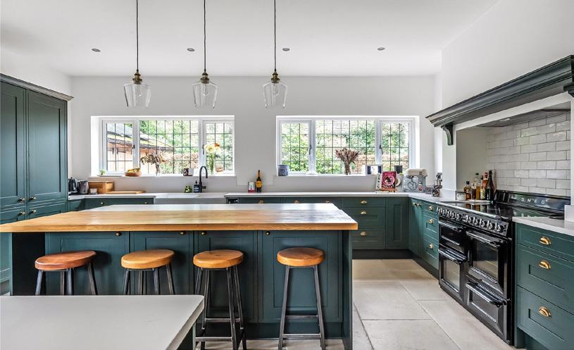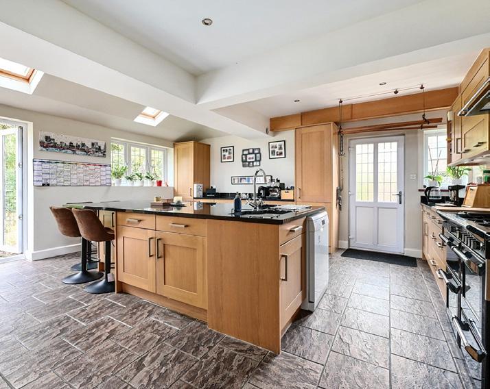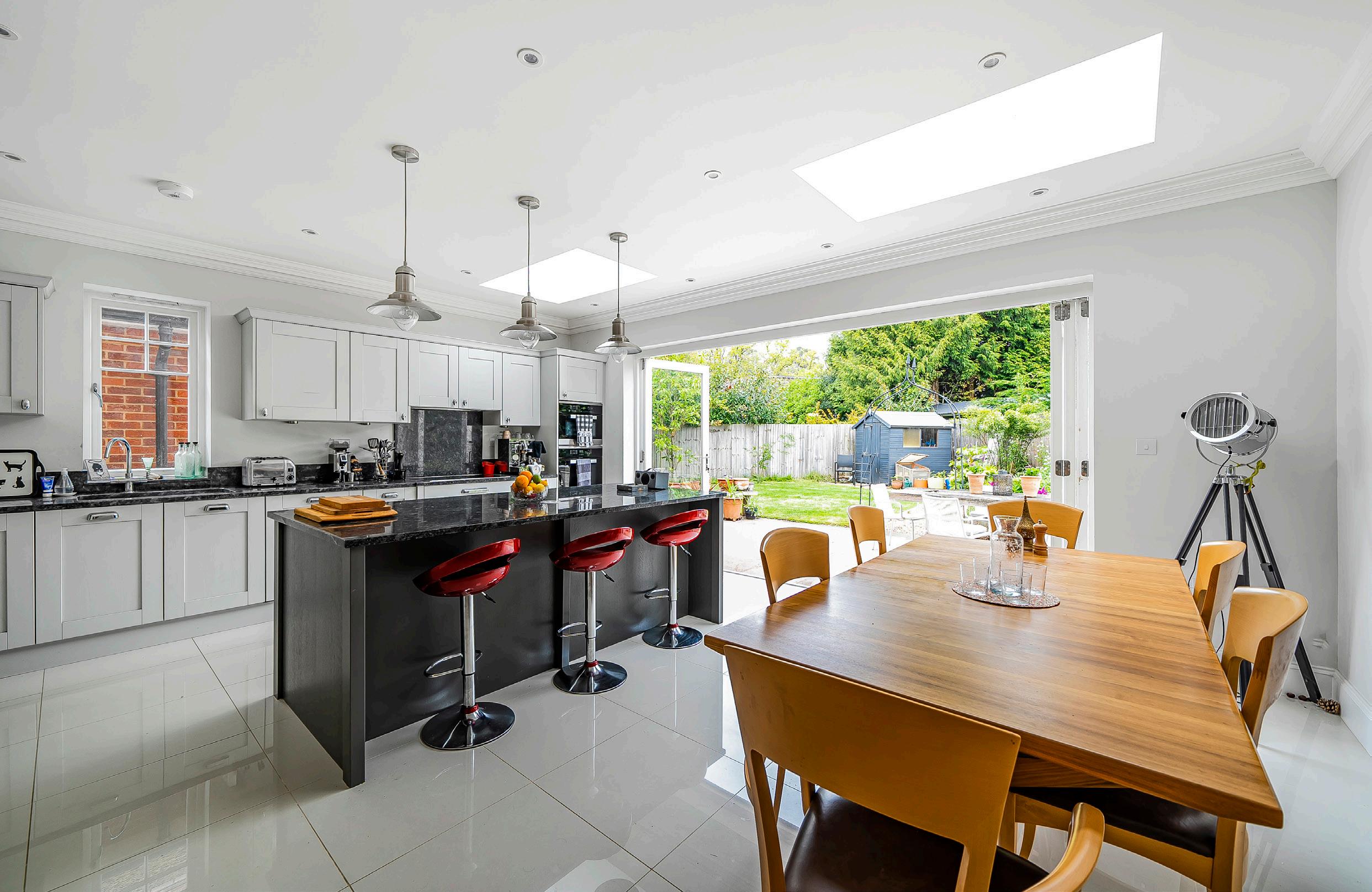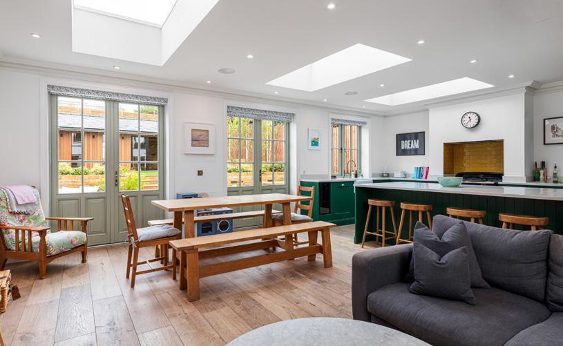 notable finishing touches. The property has been designed with large families in mind and includes the convenience of two dishwashers, two fridges, two washing machines, and extensive cupboard storage. Fitted bench seating curves snugly into the bay of the windows and a matching waterfall island with ample bar stool seating defines and unites the open plan design from the dining room area that blends seamlessly with the terracing via double aspect bi-fold doors. Perfectly placed, the roof lantern gives you the chance to dine beneath a canopy of stars.