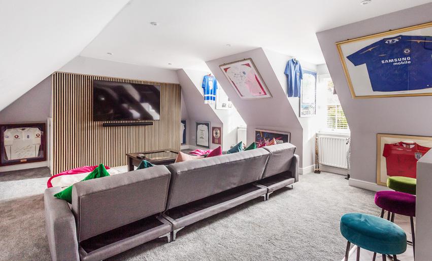 A further staircase rises to the top floor, where the accommodation continues to impress. Here, a fifth double bedroom and a separate bathroom are complemented by a substantial cinema and media room. This versatile space, ideal for family film nights or entertaining on a larger scale, could also be adapted into a self-contained suite for guests, extended family, or staff, demonstrating the home’s flexibility to suit a variety of lifestyles.