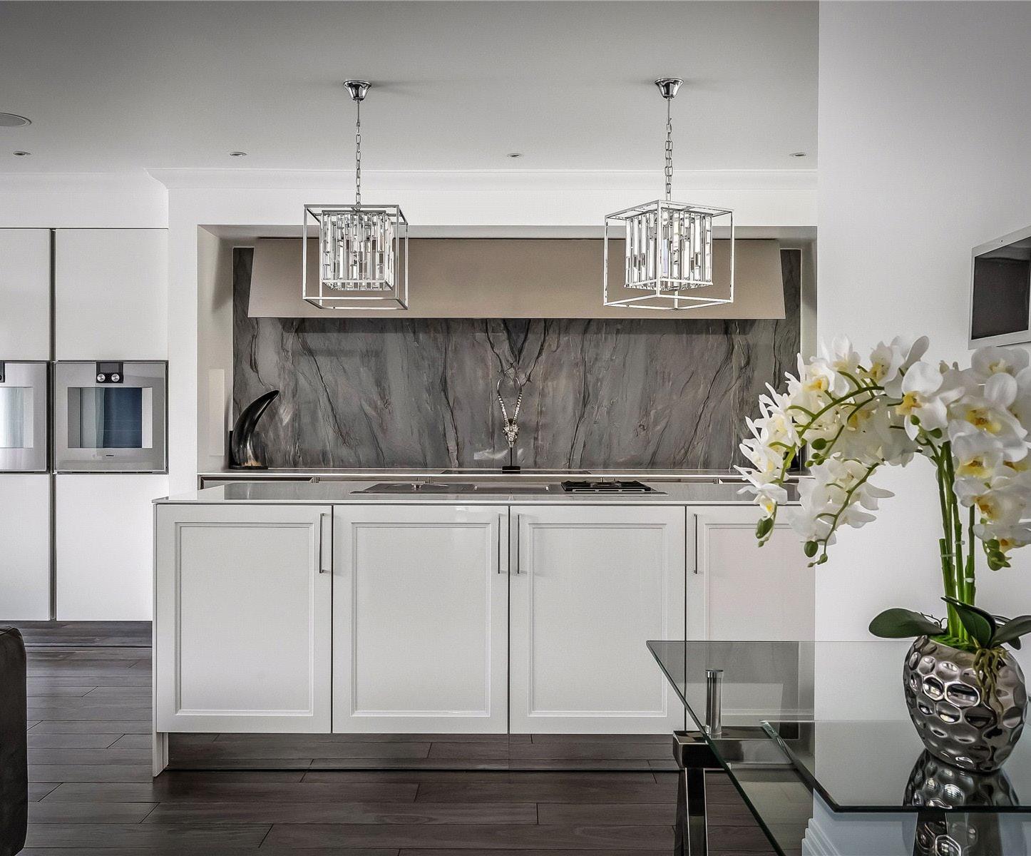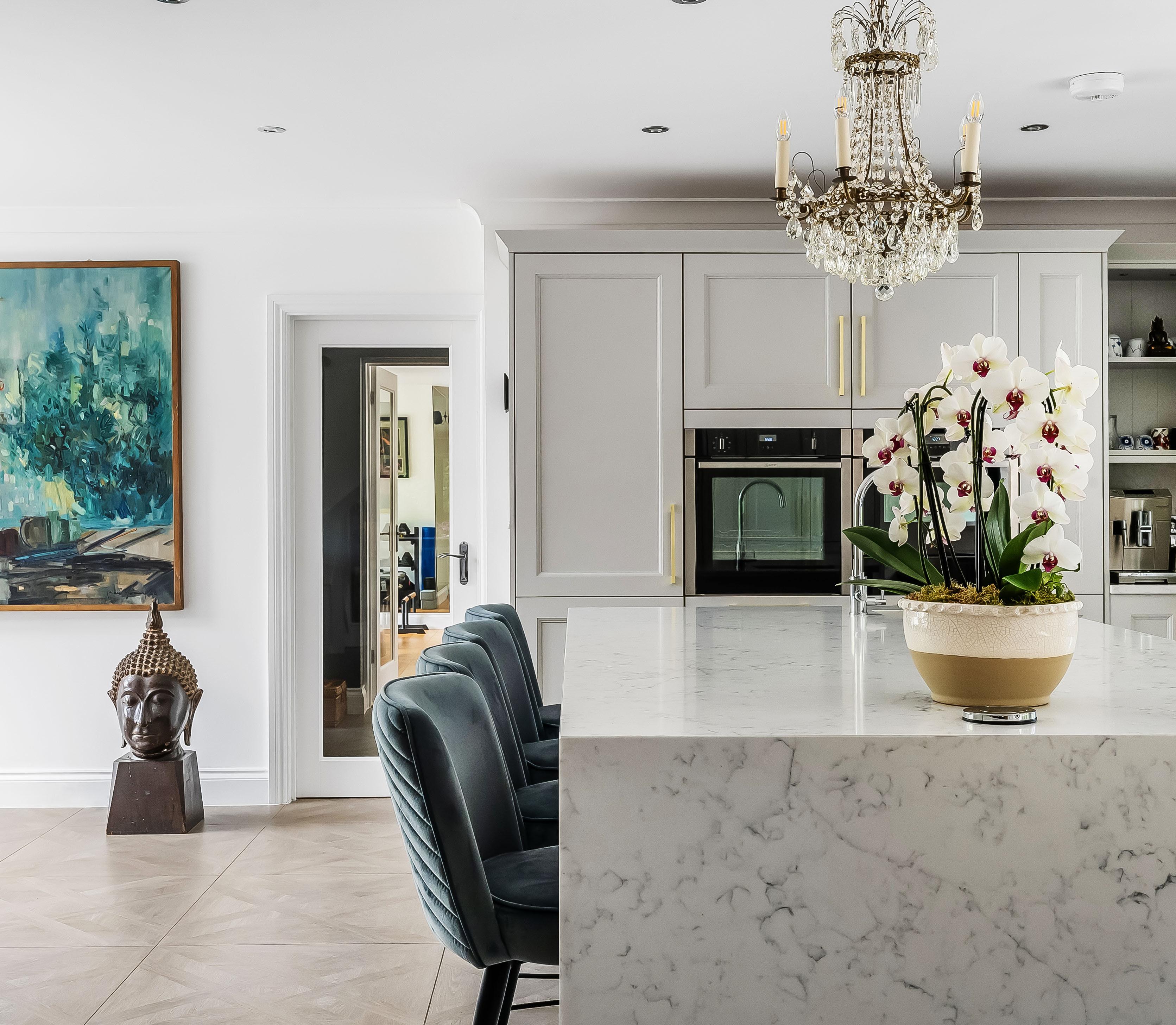 A tasteful change in flooring gives delineation to the supremely well-appointed kitchen where bespoke Shaker cabinetry is topped with the clean minimalist lines of non-porous quartz and includes plinth drawers that add to an already impressive measure of storage. A first-class array of integrated appliances includes a duo of eye-level ovens, a warming tray, dishwashers, fridges and a freezer, while a Quooker hot tap, an In-sinkerator and filtered drinking tap are