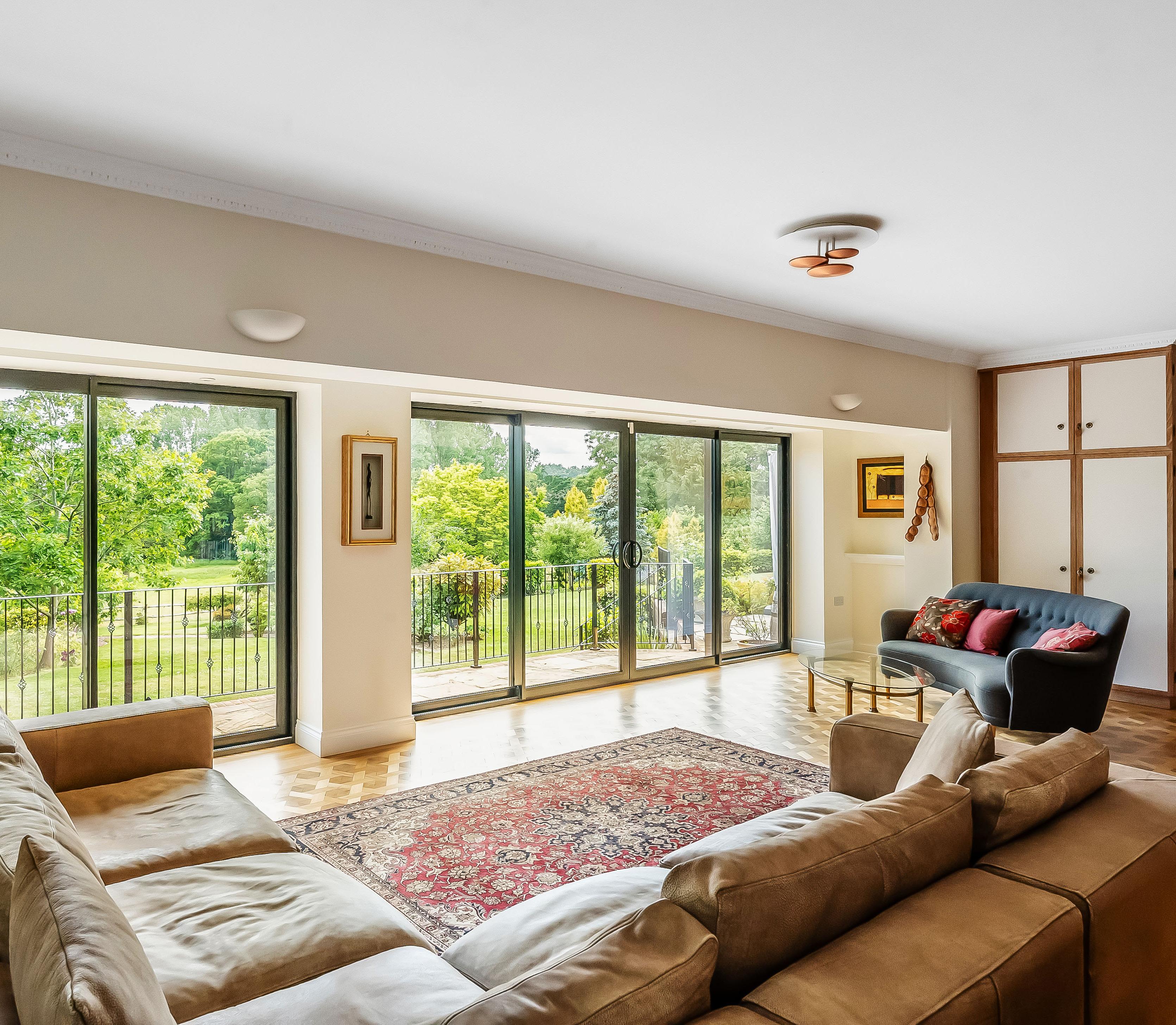 With an expanse of French and sliding doors, the ground floor of Burdenshot House sits in harmony with blissfully secluded gardens. To both front and back, the spacious grounds adjoin fields which are jointly owned by the residents of the private road, allowing your gaze to wander uninterrupted into the distance and making it easy to escape from the hubbub of the world.