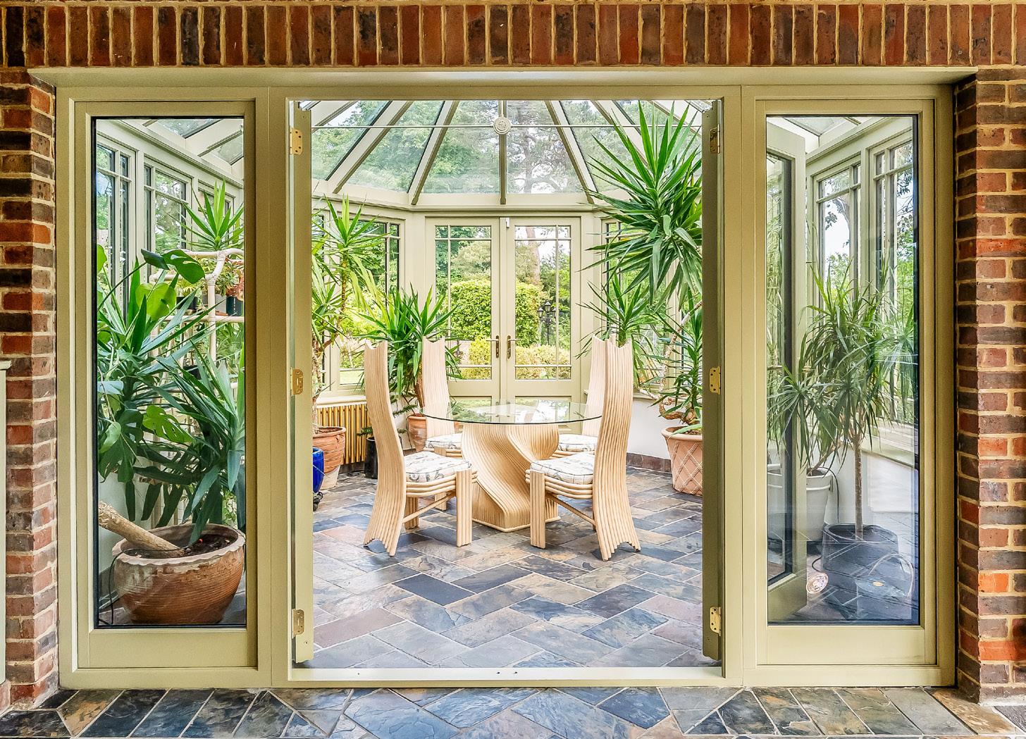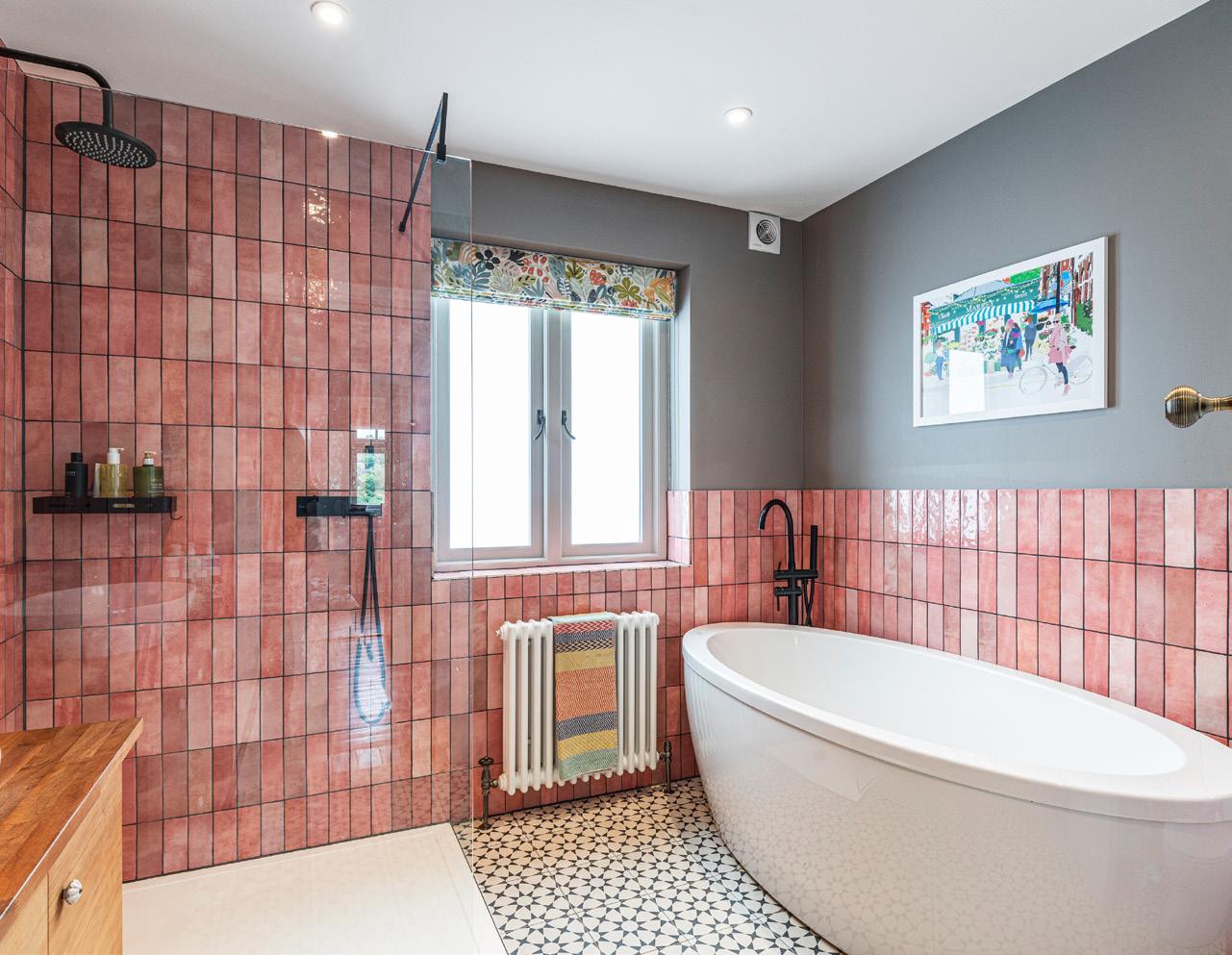 It’s there that bespoke bookshelves have been beautifully crafted to complement the cabinetry of the kitchen and tailor-made blinds lend a dash of colour. Adding to the sense of space, a wide archway tempts you into an outstanding garden room encased in floor-to-ceiling glazing with twin sets of bi-fold doors that let the terracing engender an extension of the house.