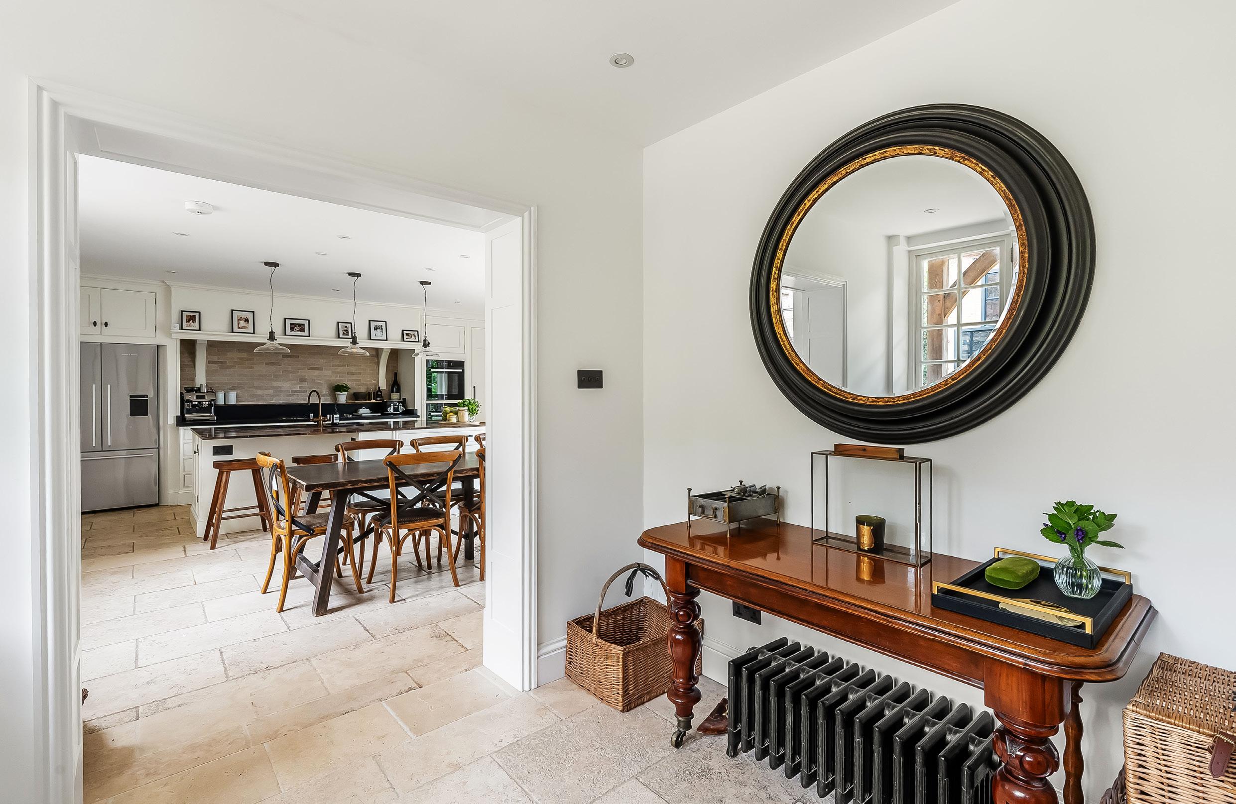 Supremely well-appointed with beautifully crafted cabinetry respectful of the property’s heritage, the outstanding kitchen has an integrated double door wine fridge to keep your favourite vintages on hand and chilled at the optimum temperature. A range cooker is housed within the chimney breast beneath a classic mantel hood and a brilliantly broad central island has copious bar stool seating. A gentle step down into the considerable dining area gives delineation to the open plan arrangement and a further wall of sliding doors makes it effortlessly easy for dinner party guests to filter out onto the terracing at every opportunity.