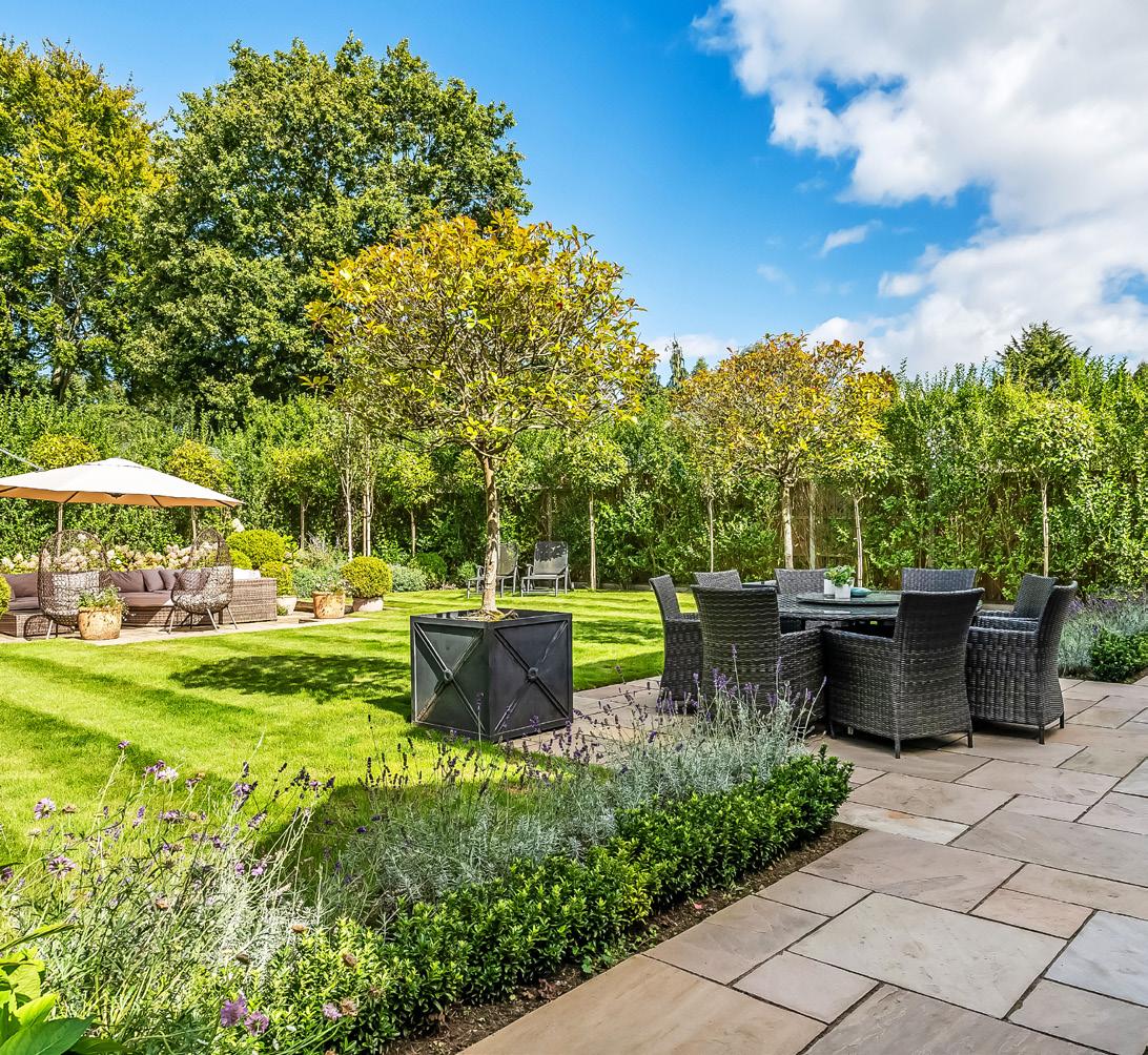The rear garden is beautifully landscaped, offering raised lawn areas, brick-edged flowerbeds, and a spacious paved terrace ideal for outdoor dining and relaxation.
