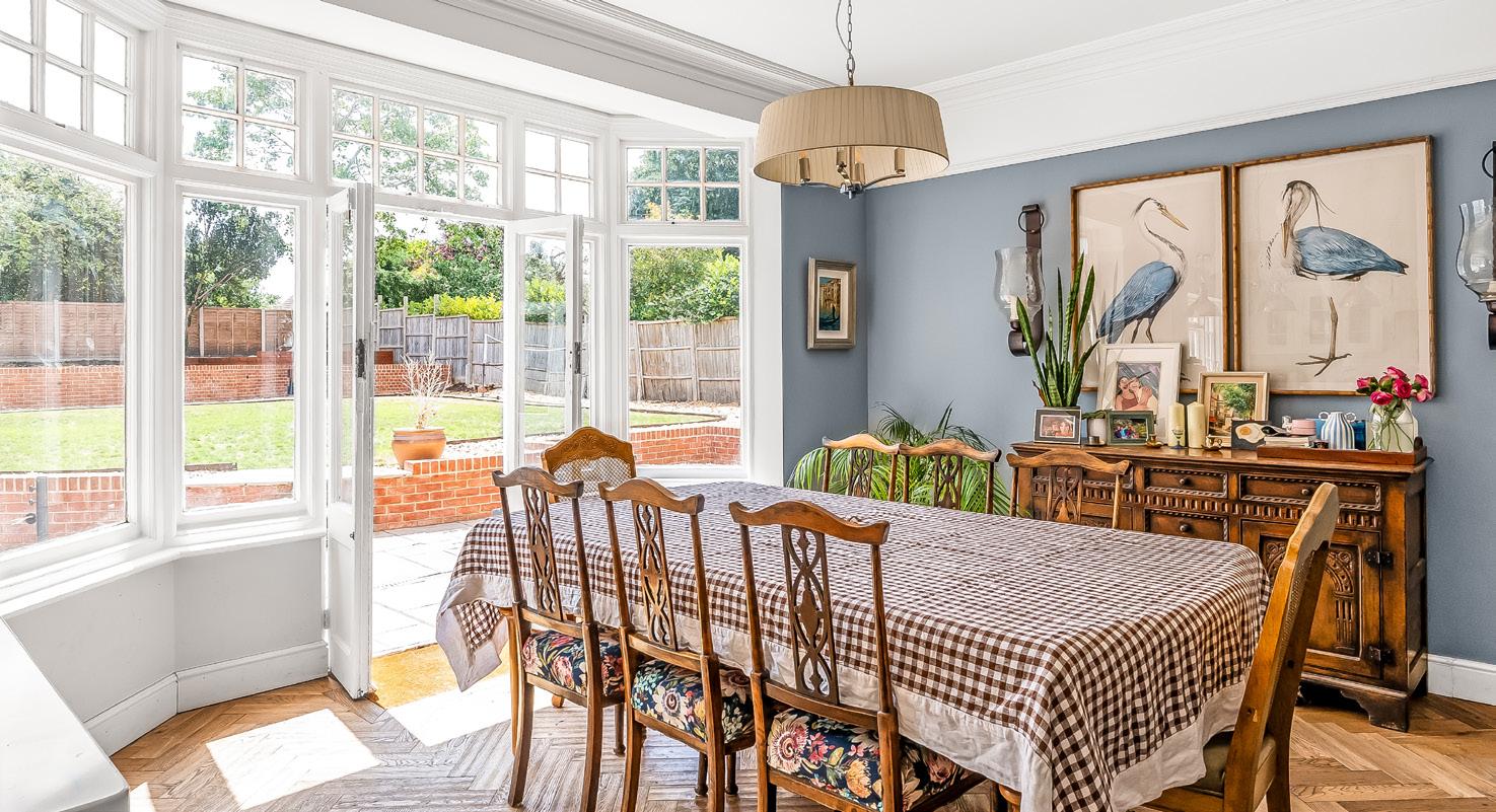 Bay windows bathe the dining room in sunlight, whilst French doors tempt you to enjoy al fresco entertaining, but with the fall-back of working fireplaces to add atmosphere during those chillier days.