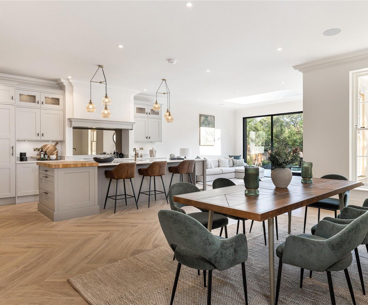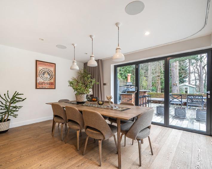 Double aspect sitting and dining rooms conjure incredibly special places in which to relax and entertain and whilst one proffers copious opportunity to spend time with family and friends the accomplished design of the other cleverly draws your gaze to the greenery of the gardens from the moment you step inside the house.