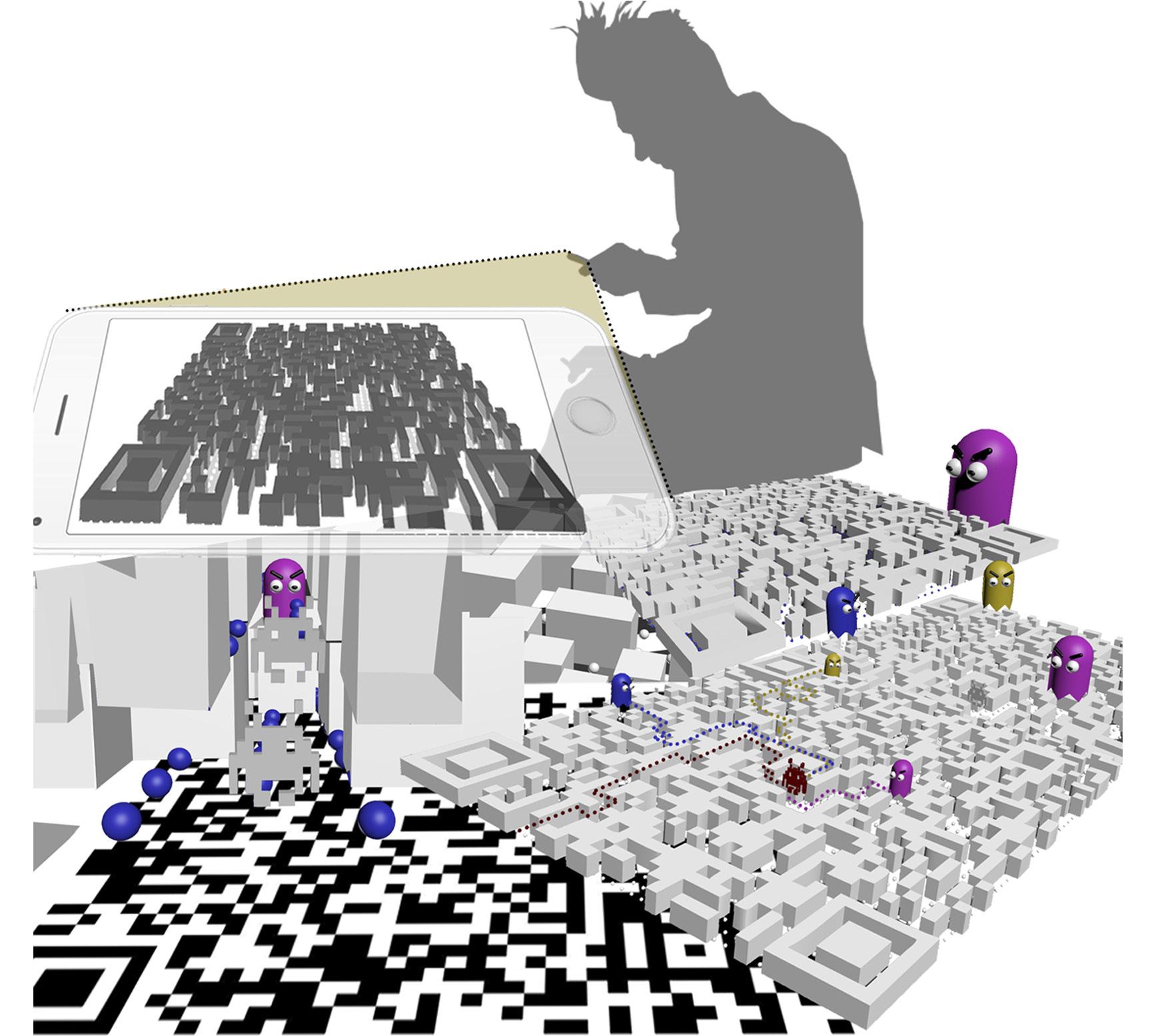 First of all, the gaming environment contains twodimensional maze area which is based on a QR code. Secondly, there are some PacDots and fruits which need to be collected during the game and finally there are main characters Pac-Man (player himself) and ghosts that player needs to avoid during the play. Those elements appear when the player scans the QR code on their screens. If the player manages to reach those fruits, a visual button appears on the screen and player has a chance to click on it and see the entire environment above.