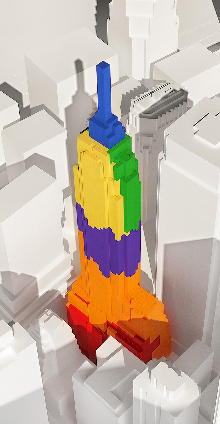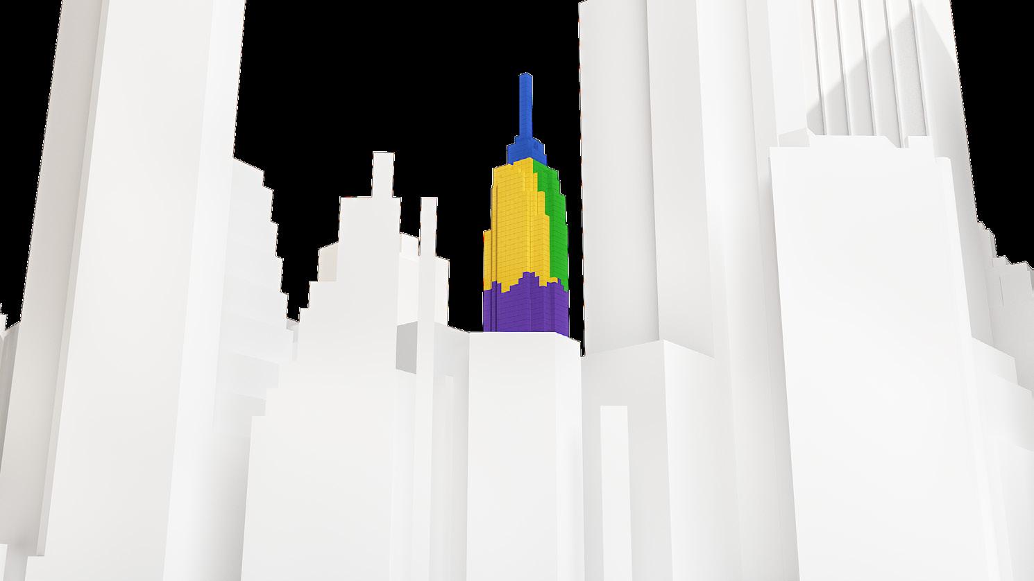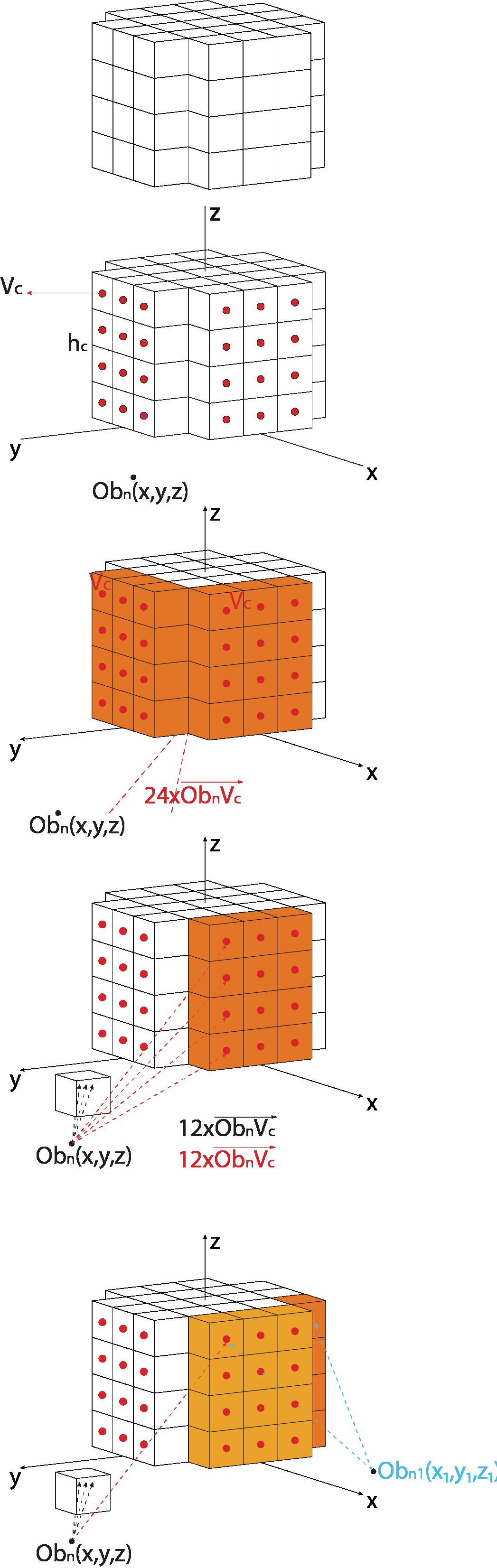 Theresults of the MOV operated with the observer points placed at the same heights at various observation points are as in the images. 4 different observation points, together with the defined obstacles, were looked at the focal point modeled by the voxel modeling method. The color of each voxel has taken on different colors depending on the number of observers interacting with it.