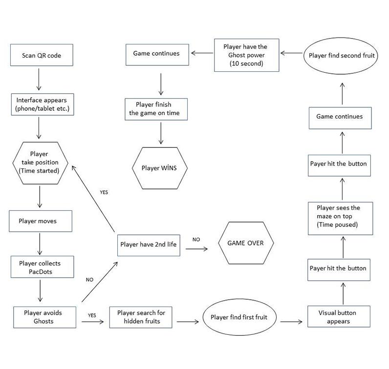 The study keeps the original logic of Pac-Man. The aim of the game collects all the PacDots in a certain period of time. In this case, it would be one hundred and eighty seconds. So, there is a main character that needs to be played by the player himself. When the game starts after scanning the QR code, player starts to move by the help of the screen while the player moving he needs to collect the PacDots but also he needs to avoid from ghosts. Every player has two lifes during the game. If a player catched by the ghost, his first life ends and the other one begins at the same point where he left. There are some hidden fruits in the game, they are randomly appears every time the game starts. If the player finds them, he gets some spatial powers. One of them creates a visual button and if the player pushes it, he has a chance to see whole maze on top. The other fruit gives the chance that flows through walls like the ghosts. At the end, if the player manages to collect all the PacDots on time, the game is over and player wins.