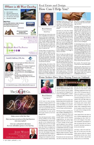 then you are choosing the individual because you respect his or her knowledge and advice. And forgive my bluntness here, but just because you are following Zillow every day, unless you are out there doing the work, then you aren’t the expert. There is homework you can do, however, to help your agent to help you. Sellers, follow your agent’s advice in prepping your property for the market. Buyers, be very straightforward with your agent and yourself about what it is you can afford and what it is you are looking for. A relationship between clients and agents can be fruitful in many ways. I don’t think anything is more rewarding than seeing my clients’ faces when I am handing them the keys to their new home, or following up with them and hearing how happy they are. Every situation isn’t perfect, nor is every agent a perfect match for certain clients. But if you do your homework in searching for the right agent, and the agent works hard to represent you, you are well on your way to success. Next month: The dreaded topic“Real Estate Fees and Commissions.” A Bay Area native, Mark Penn has been a REALTOR® with Coldwell Banker since 2004. He is also active in animal welfare, and is a former educator, facilitator, and air traffic controller. Mark can be reached at mark@MyHomeInSonoma.com.