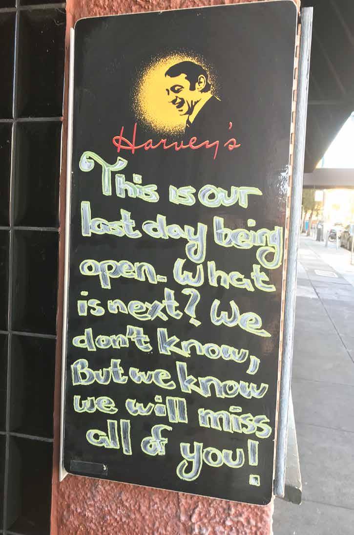 Like the sudden and unexpected death of a loved one, the abrupt closure of restaurant, bar, and community venue Harvey’s on January 22, 2023, left many in the Castro saddened and in shock. Aside from a message on a dry-erase board placed in front of the site earlier that morning, there had been no prior public notice of closure, no final announced event, and no proper chance to say goodbye and absorb the loss with fellow patrons. On Instagram that day, the Harvey’s team simply shared, with an image of the board, “The writing is now on the wall. We will always love you!”