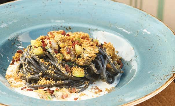 The pastas—all made in house— are a highlight of the menu. On the first visit, we chose the delicata squash agnolotti with pepitas, pomegranate, and pear—an imaginative and unexpected combination, which we declared “fall/winter pillows of deliciousness.” On our follow-up visit, our party sampled the delectable squid ink tonnarelli. The dish imaginatively blends Maine lobster, Calabrian chili, ginger, garlic, tomatoes, and gremolata. That even pleased our two guests who live part-time in Orvieto!