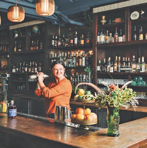 transported to a chic New York supper club. New owner Samantha Bechtel, who happens to be Duvall’s daughter, has mastered a ravishing renovation with the help of design firm Gachot Studios. It’s reminiscent of one of my favorites, the famed Monkey Bar in New York. A captivating mural by artist Matthew Benedict wraps around the firstfloor dining room, with characters from William Saroyan’s The Time of Your Life front and center. Why Saroyan? He was a favorite author of the original Izzy Gomez, the long-lost Barbary Coast saloonkeeper for whom the chophouse is named.