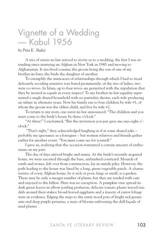 Vignette of a Wedding –– Kabul 1956 by Prita K. Shalizi A trio of sisters-in-law arrived to invite us to a wedding, the first I was attending since marrying an Afghan in New York in 1945 and moving to Afghanistan. It involved cousins; the groom being the son of one of my brother-in-laws; the bride the daughter of another. To exemplify the intricacies of relationships through which I had to tread delicately avoiding sensitive toes bared prominently: of the trio of ladies, two were co-wives. In Islam, up to four wives are permitted with the stipulation that they be treated as equals in every respect! To my brother-in-law equality represented a single shared household with no partiality shown, each wife producing an infant in alternate years. Now his family ran to four children by wife #1, of whom the groom was the oldest child, and five by wife #2. To return to my story, one sister-in-law announced: “The children and you must come to the bride’s house by three o’clock.” “At three!” I exclaimed, “But the invitation you just gave me says eight o’clock.” “That’s right,” they acknowledged laughing as if at some shared joke – probably my ignorance as a foreigner – but women relatives and friends gather earlier for another event. “You must come see for yourself.” I gave in, realizing that the occasion warranted a certain amount of enthusiasm on my part. The day of days arrived bright and sunny. At the bride’s recently acquired home, we were escorted through the bare, unfinished courtyard. Mounds of earth and stones, left over from construction, lay in untidy piles. However, the path leading to the house was lined by a long, green vegetable patch. A characteristic of every Afghan home, be it rich or poor, large or small, is a garden. There may be only a meager number of plants, but they are tended with care and enjoyed to the fullest. Here was no exception. A pumpkin vine spread its dark green leaves in elbow-jostling profusion, delicate tomato plants waved tendrils around their stakes; broad-leaved eggplants and a tracery of carrot foliage were in evidence. Edging the steps to the entry stood pots of bright red geraniums and deep purple petunias, a mass of blooms enlivening the dull façade of mud plaster.