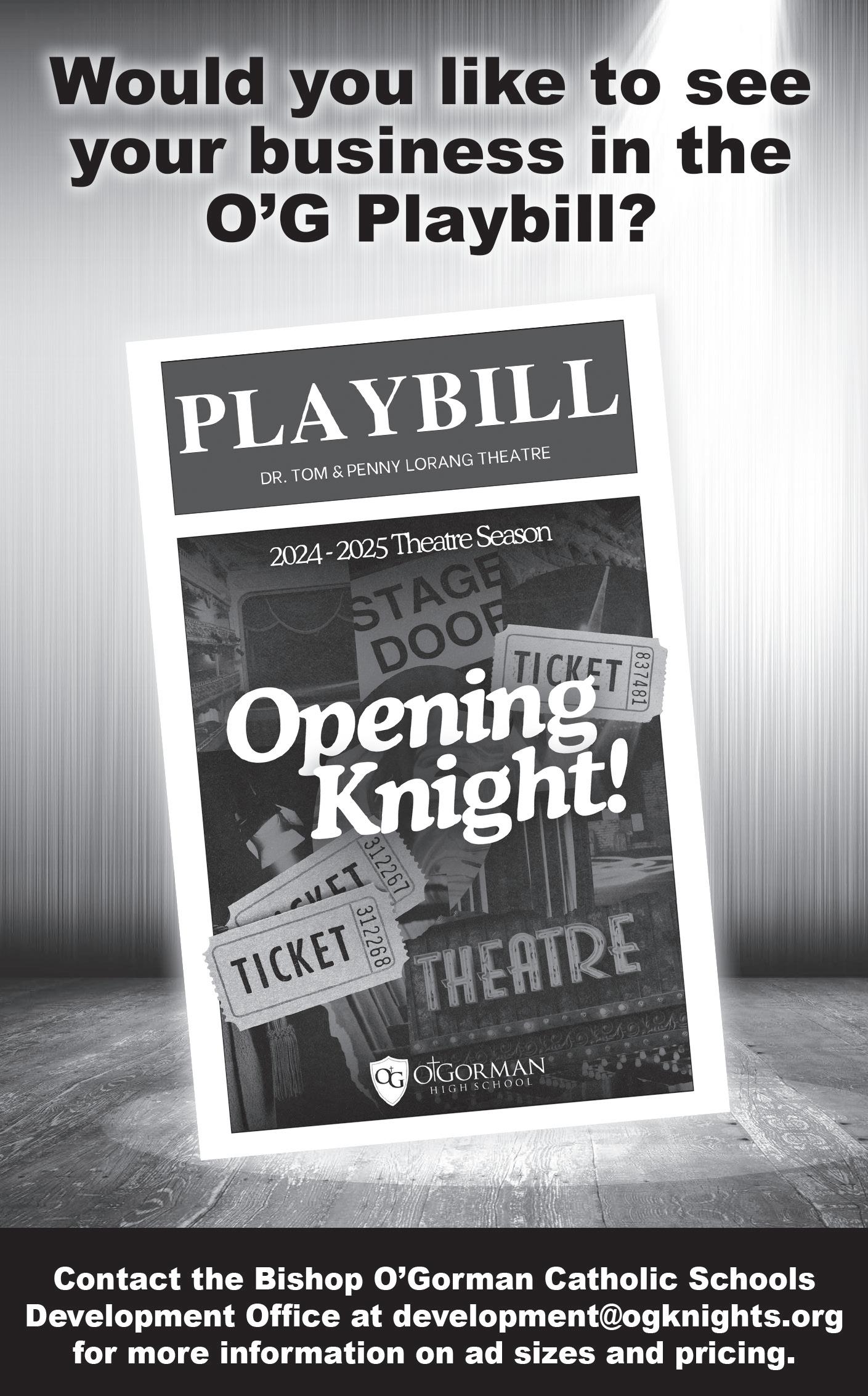 We warmly welcome our valued patrons as we celebrate the heart and spirit of O’Gorman High School Theatre. Our exceptional theatre department, guided by a passionate director and supported by an outstanding staff, is a hub of creativity. At the core of it all are our students— brilliant stars whose incredible talent and commitment consistently go above and beyond. With deep respect for our rich history and a true sense of being blessed as part of a Catholic school, we invite you to join us on a journey of theatrical excellence that reaches far beyond the stage.