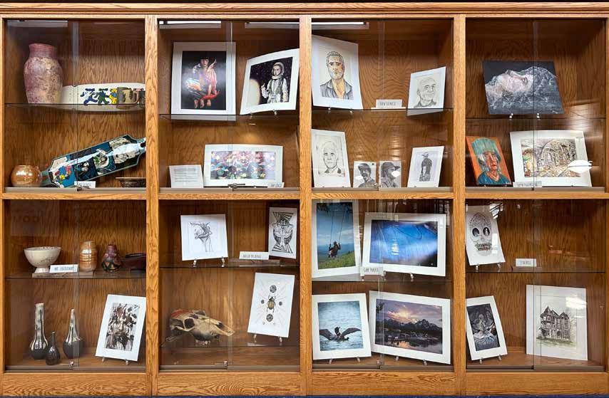 (‘99) framed print, and Patrick Frankman’s (’98) pottery pieces and photography. On the left side of the cabinet we have four amazing O’G artists featured. They could be professional artists already!