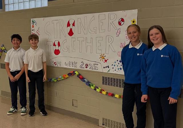 ● Holy Spirit: Hope Squad members promoted kindness, inclusion, and anti-bullying through classroom activities and visual reminders, like students wearing bright shirts to “shine bright” for others. The Squad’s yearlong focus is on building a ripple effect of good deeds and intentional friendship.