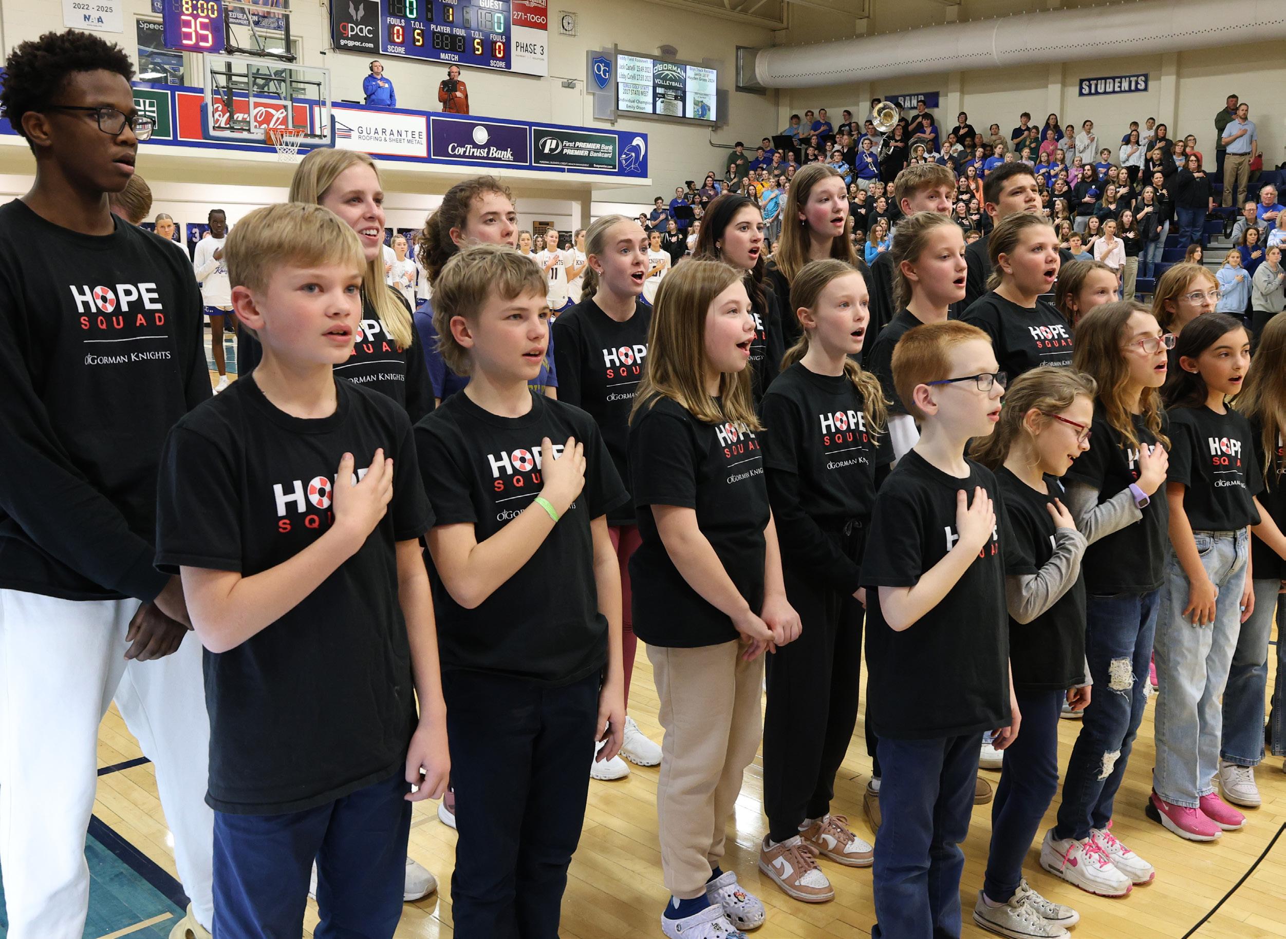 “There were over 20 O'G Hope Squad members from fourth grade through senior year singing the National Anthem. There were over 20 junior high Hope Squad members sprinkled throughout the high school pep band playing. In the stands, there were over 50 Hope Squad members buddied up and cheering,” said Mrs. Robey. “I guess we didn’t anticipate how well it would bring all levels from all schools together and for such a cool mission! It was a really beautiful moment.”