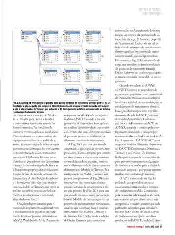 do componente e é usado pelo Modelo de Tensões para prever as tensões e deformações resultantes a partir do histórico térmico. As condições de contorno térmicas aplicadas ao Modelo Térmico devem ser representativas do equipamento utilizado na realidade e, assim, a caracterização de todos os equipamentos para obtenção dos coeficientes de transferência de calor é fortemente encorajada. O Modelo Térmico usa a distribuição de carbono para determinar o tempo das transformações de fase e as subsequentes propriedades térmicas em função da fase, do teor de carbono e da temperatura. A distribuição de carbono e o histórico térmico são então mapeados no Modelo de Tensões, que prevê as tensões durante o processo, o deslocamento e a evolução microestrutural, além da dureza final. Uma abordagem intuitiva para o método de acoplamento sequencial para o modelamento de processos de tratamento térmico é possivel utilizando-se ANSYS Workbench. A Fig. 2 apresenta