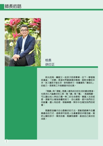 時光荏苒,轉眼又一批孩子即將畢業,往下一學習階 段邁進。「改變」是這世界最真實的情境,面對多變的未 來,為了讓孩子能生存、保有競爭力,培養擁有「最佳化」 的能力,是教育工作者最基本的任務。 「閱讀」與「運動」是讓人類有成功的生活的最佳管道, 也是活化大腦最好的工具。閱「讀」閱「獨」,透過閱讀, 可以讀出他人與自己獨一無二的生命歷程,豐富人生的經 歷;運動可以增強身體免疫力、活化細胞、提升我們的正 向能量,讓人有自信、積極樂觀,無形中也增加我們的財 富。 閱讀是涵養內在心靈最好的方法,運動是鍛鍊外在體 魄最佳的方式,這兩項可說是人生最重要的休閒活動。期 許山豐的孩子,秉持良善、閱讀悅健康,創造自己美好的 成就。