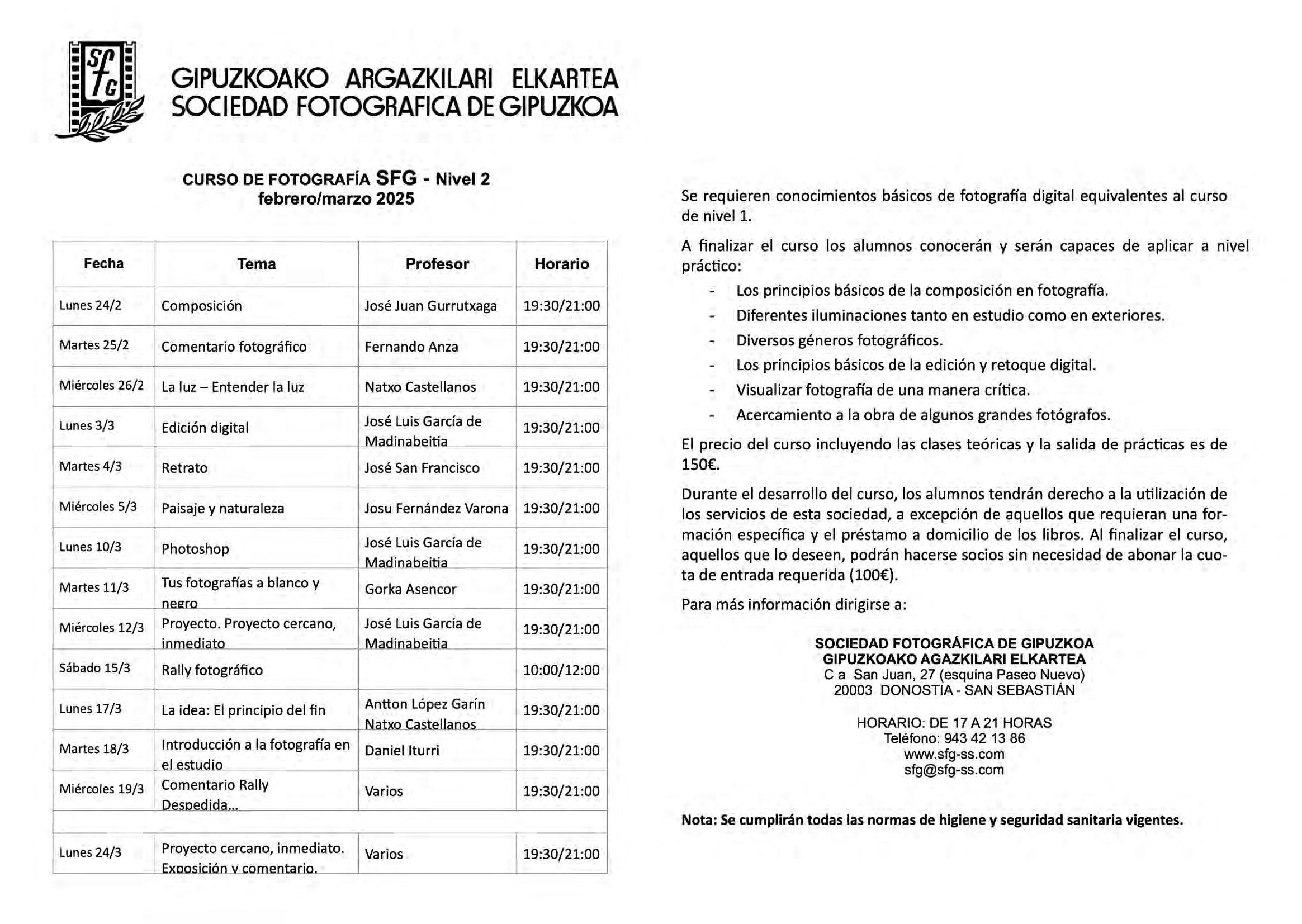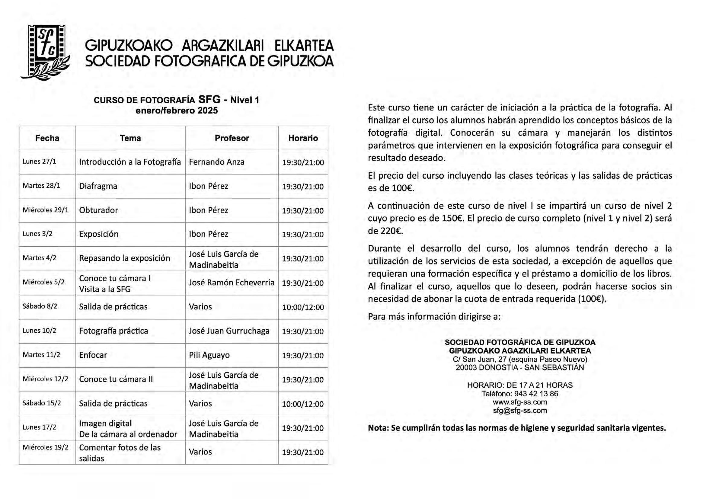 Miércoles5 19:30 CURSO DEFOTOGRAFIA NIVEL1:CONOCETU CÁMARA I.VISITA A LA SFG