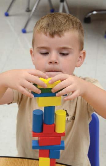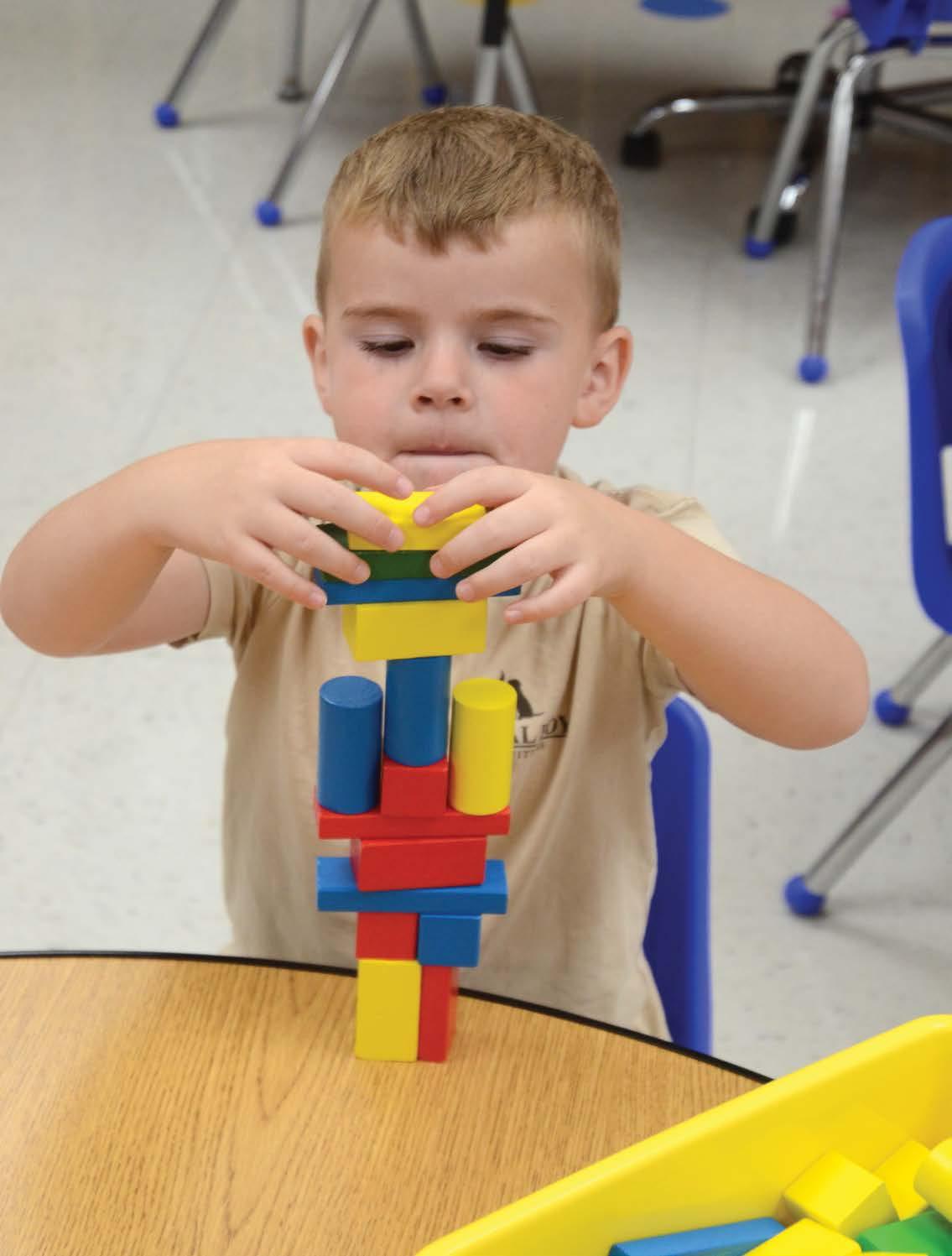 Grayson Watkins stacks blocks at the Lakeside Primary School’s preK program for four-year-olds. Students rotate among activity centers as part of the school day. Teachers and school leaders say it gives students a head start and helps the school see which students might need an intervention before they start kindergarten.