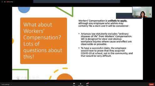 School board members also have experienced this change. Many board meetings were held remotely – either through voice conferencing, online, or Zoom. Most professional development also changed to a virtual setting. ASBA already had a cadre of online courses for board members through AR-PBS. However, we quickly adapted our on-site conferences and workshops to a virtual format, mostly using Zoom meetings and Zoom webinars. Kristen Garner, ASBA staff attorney, has provided several opportunities in the areas of employee supervision, FMLA and other topics. School finance for board members is another workshop provided by Robyn Keene, a longtime school district chief financial officer and current Arkansas Association of Educational Administrators employee. In addition, ASBA conducted a widely attended and informative live Zoom workshop in early July to facilitate the conversation about returning to school. ASBA also held traditional conferences on the Zoom platform including the ASBA/AAEA Joint Conference, the New Board Member Institute and the Administrative Assistants Workshop. Although almost everyone (including me) would much rather have face-toface experiences, many board members have made favorable comments about their virtual experiences. I predict some