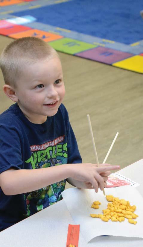 Sarah Burns, director of the district’s academic summer camp program, helps first grader Lilith Boyd use chopsticks to eat goldfish crackers as part of a study of China. The district holds two two-week camps for students in grades pre-K to eighth.