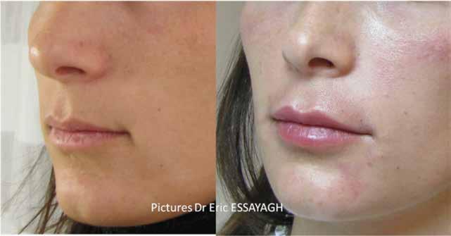 La pureté des contours des lèvres fines déshydratées, sera améliorée préférentiellement par des gels d’AH à particules fines, gels élastiques et assez fermes, type : Restylane Kysse®, Belotero Balance®, Stylage M®, à condition d’une injection à l’aiguille fine, très superficielle, le long du contour des lèvres roses, tout en restant dans la muqueuse rose des lèvres et pas dans le canal virtuel, qui donnera rapidement un bourrelet plus visible.