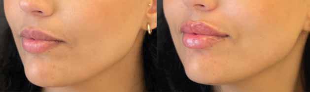 biné d’AH , l’un assez volumateurs au niveau des zones en creux, comme à la base du nez ou au niveau des creux mentonniers, l’autre plus fin pour le reste du sillons naso labial et le reste de la lèvre blanche (Restylane Defyne®,Restylane Refyne®).