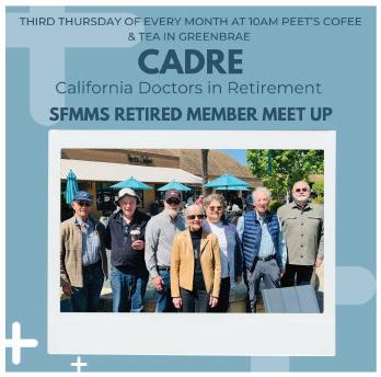 "The monthly CADRE meeting is always fun. This gathering is for special people, who have had unique lives. As retired SF and Marin physicians, we can be best understood by each other.” Join your fellow retired physician colleagues for CADRE (CAlifornia Doctors in REtirement) for casual conversation, connection, & free coffee, monthly (3rd Thursday of the month) at Peet's Coffee in Greenbrae.