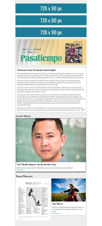 From vacationers, to seasonal residents, to long-time Santa Feans — Pasatiempo readers enjoy the thrill of new ideas and experiences and have a deep appreciation for the arts. Internationally-renowned arts festivals and generous local benefactors help Santa Fe to support an arts community on par with major metropolitan cities. For local patrons of the arts, Pasatiempo stands alone as the go-to resource for arts and culture event information.