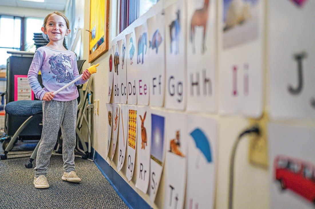 LilithIndigoleadsthecombinedkindergartenandfirstgradeclassroomduringaquickrun-throughoflettersandthesounds theymakeatTesuqueElementarythismonth.Kindergartenenrollmentinthedistricthasdeclined32%inthelastdecade.