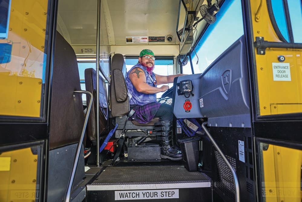 GABRIELACAMPOS/THENEWMEXICAN BusdriverEliMadridpreparestotransportstudentsfromElCaminoRealAcademythismonth.