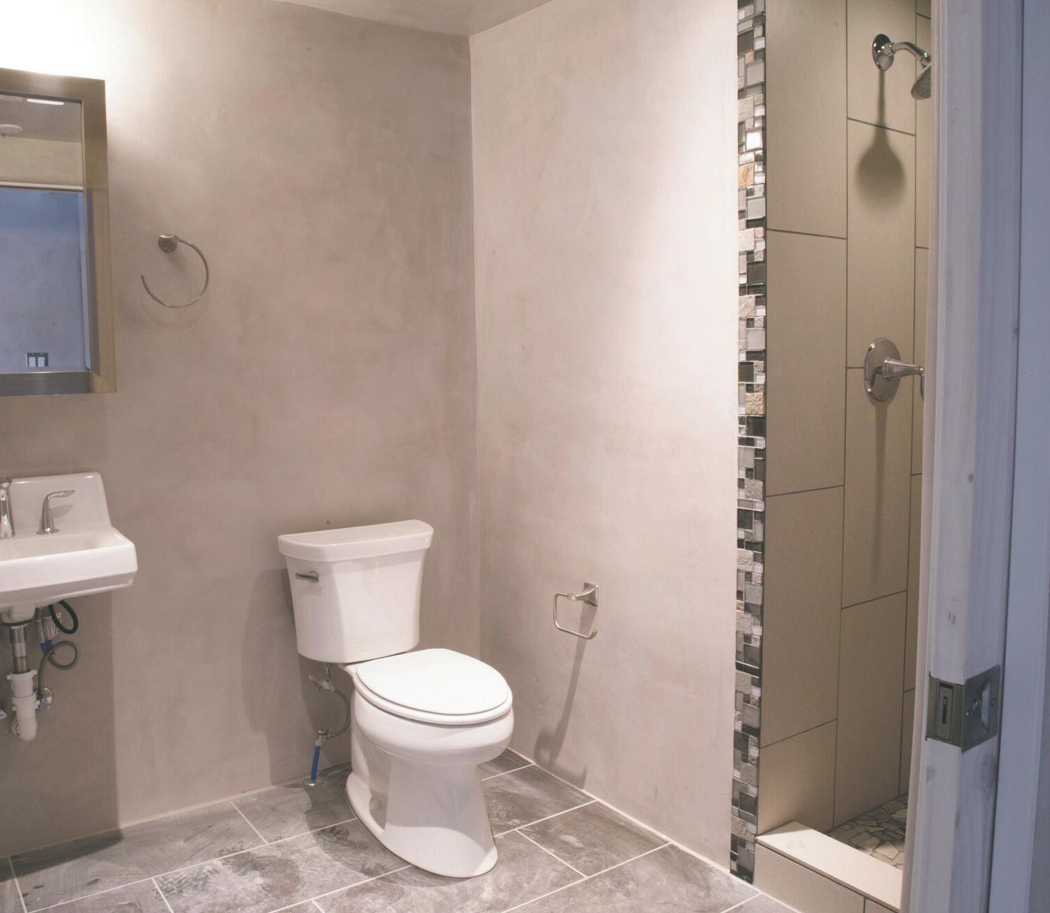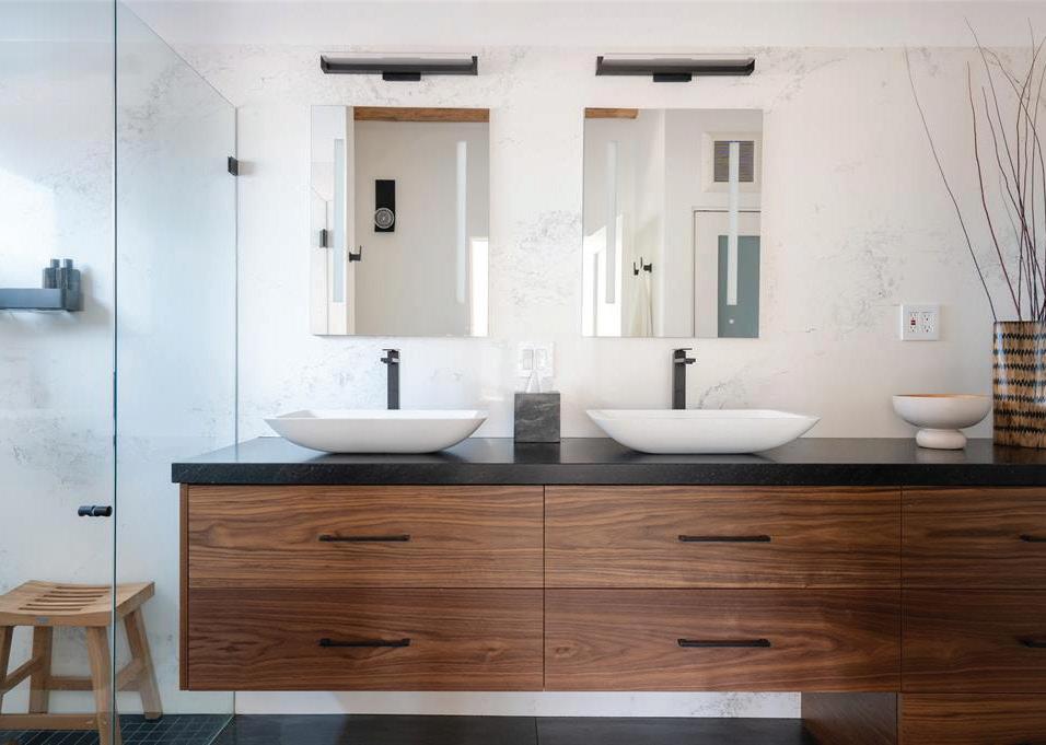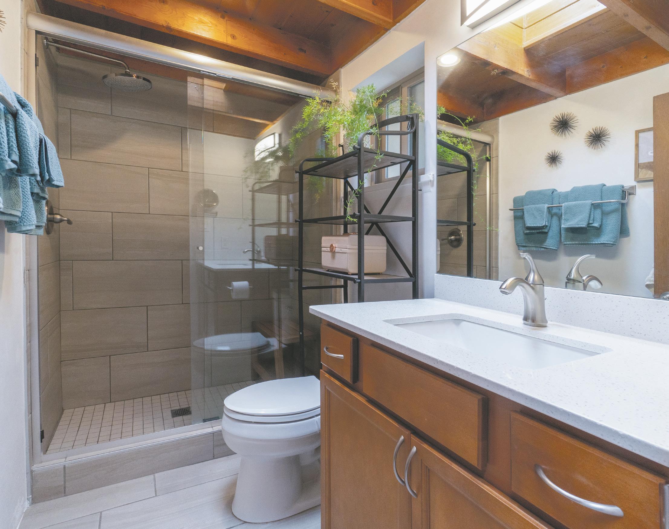 sourced a reclaimed beam for the bathroom, which she paired with a live-edge wood shelf in the custom concrete vanity with integrated sink. Three Roots Design worked with J.M. Evans Construction Inc. to bring the vision to life.