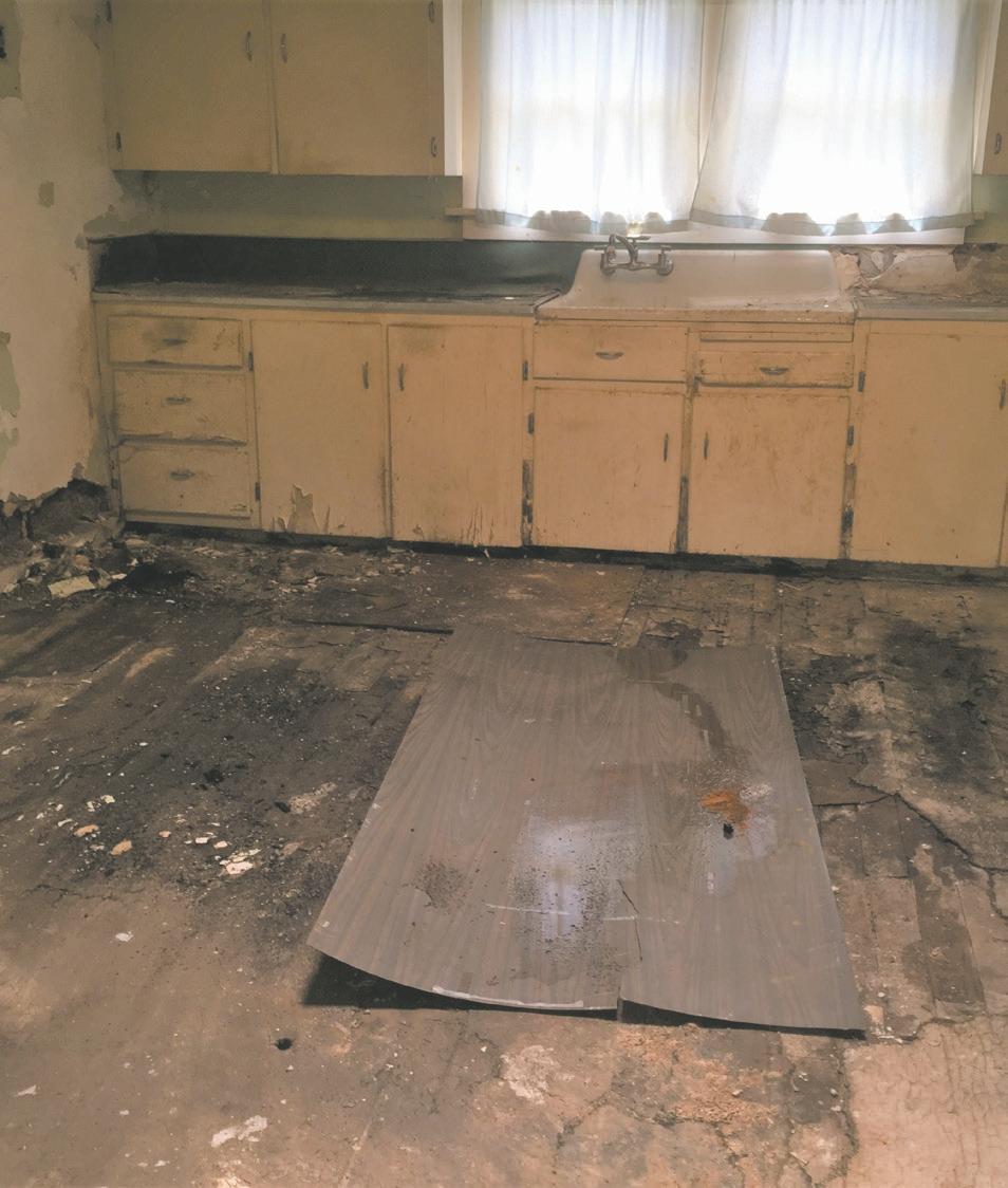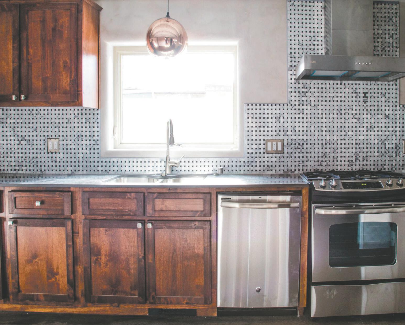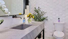 attention to detail and the right professionals to remedy these problems. Once the hazards were remediated, Palo Santo was able to dramatically improve the flow of an outdated floor plan by opening load-bearing walls and reconfiguring bathrooms, the kitchen, and other living spaces. It also installed new hardwood floors, custom cabinets, quartz countertops, and marble tile.