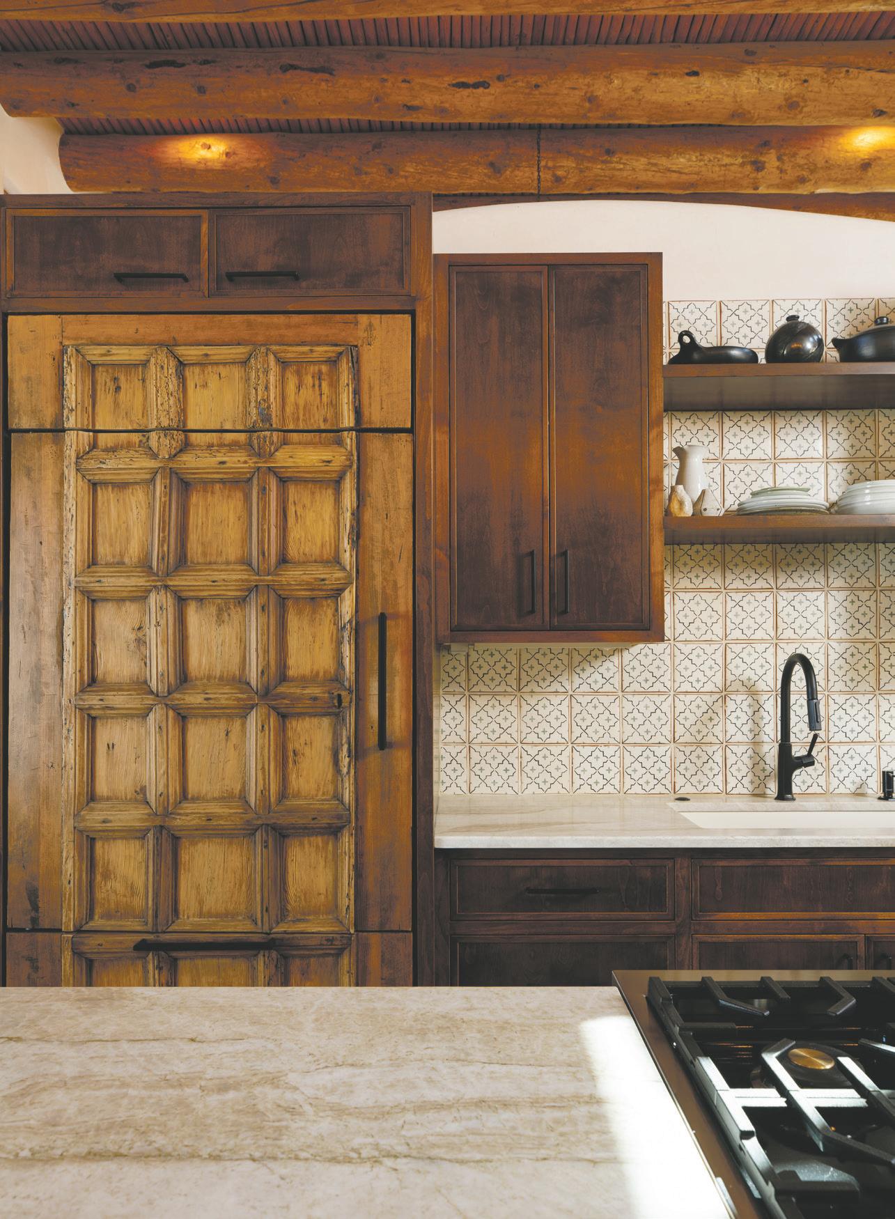 creating a kitchen and pantry that carried equal visual weight. In doing so, she had the opportunity to craft a truly unforgettable kitchen, brimming with personality, meticulously thought-out details, and functionality. One standout feature is the coffee station, adorned with stunning Tabarka tile that seamlessly extends into the iron upper cabinetry. The iron detail is further echoed in the hand-forged light fixtures specially made for this space. Overall, the kitchen exudes sophistication and attention to detail. Neubleu even repurposed an antique door to clad the refrigerator door, adding a touch of charm and character.