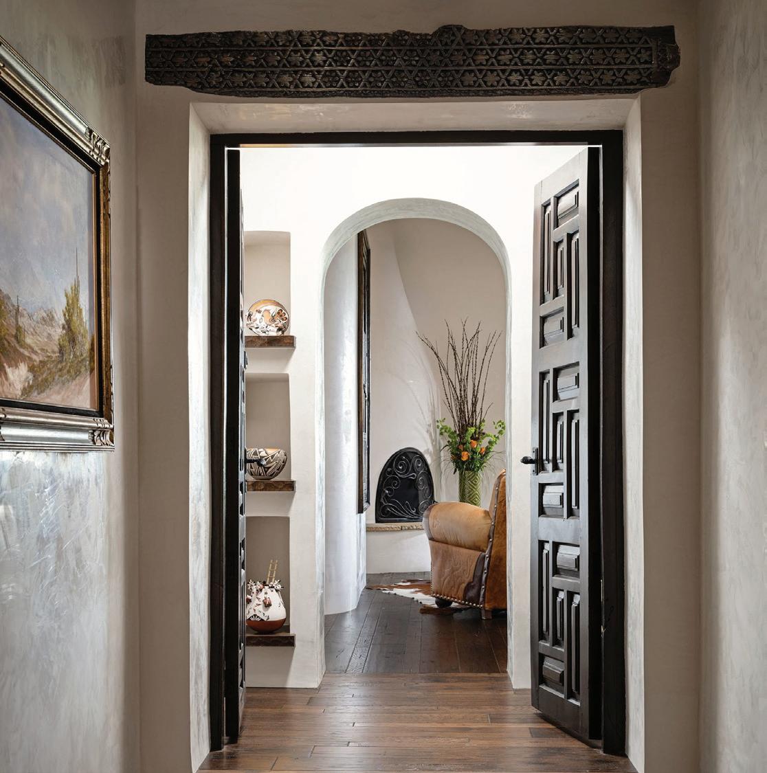 Interior designer Susan Trowbridge, principal of S. Trowbridge & Co., added details that provided character and personality, such as nichos, consistent with the home’s style. She in turn brought in artisan Leonel Capparelli of Hands of America to provide distinctive woodworking in these spaces. The living room/ dining room fireplace, which previously had a standard shape and brick facade, was remade into a trapezoidal structure, creating a new focal point in that space and the residence as a whole.