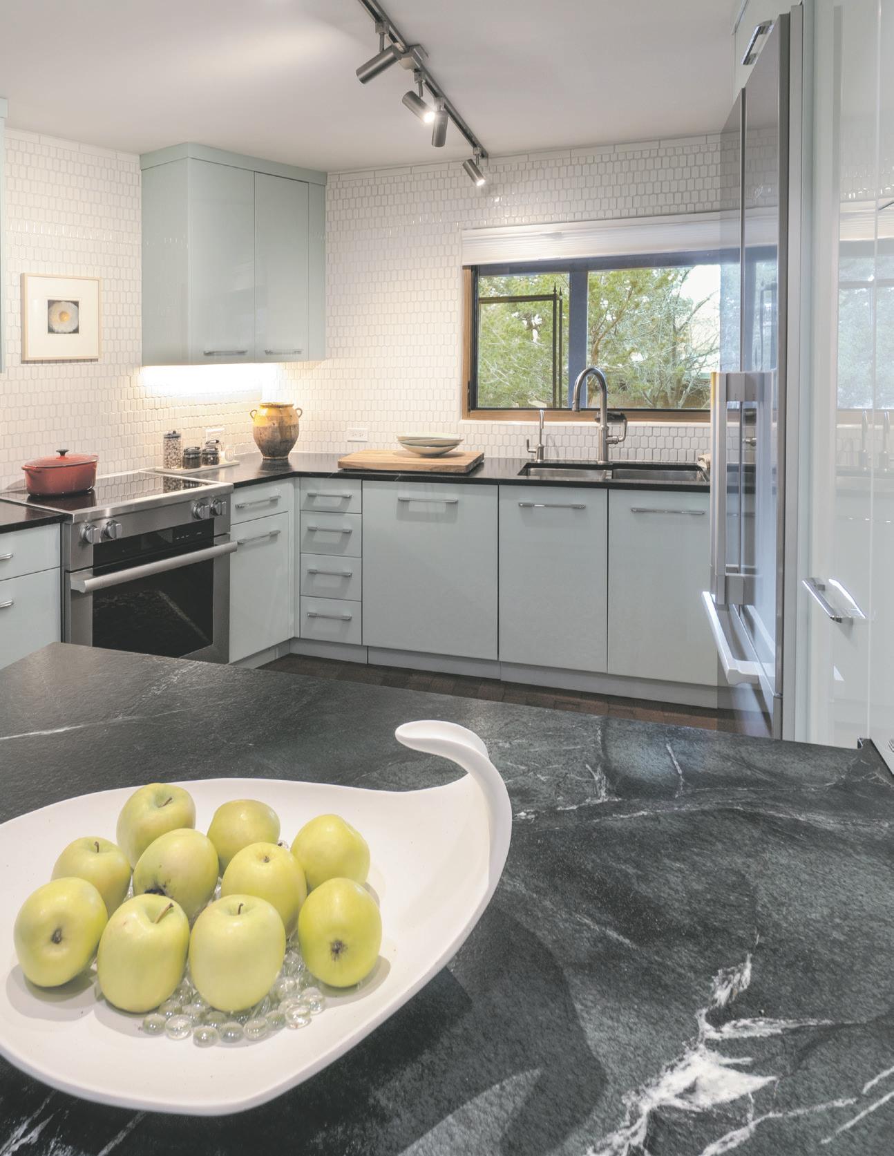 In the kitchen, the homeowners wanted to keep stainless steel countertops that had served them well. Lead contractor Ray Valdez painstakingly removed, refinished, and reinstalled the countertops. Mason shaped her design around these countertops and selected other finishes to coordinate seamlessly with them. Mason says that leaning into such design requirements gives clients a home that best suits them and results in wonderful surprises for her. “The design evolves for me in a way I never would have thought of,” she says. The result, which came in on budget, is all the better for it.