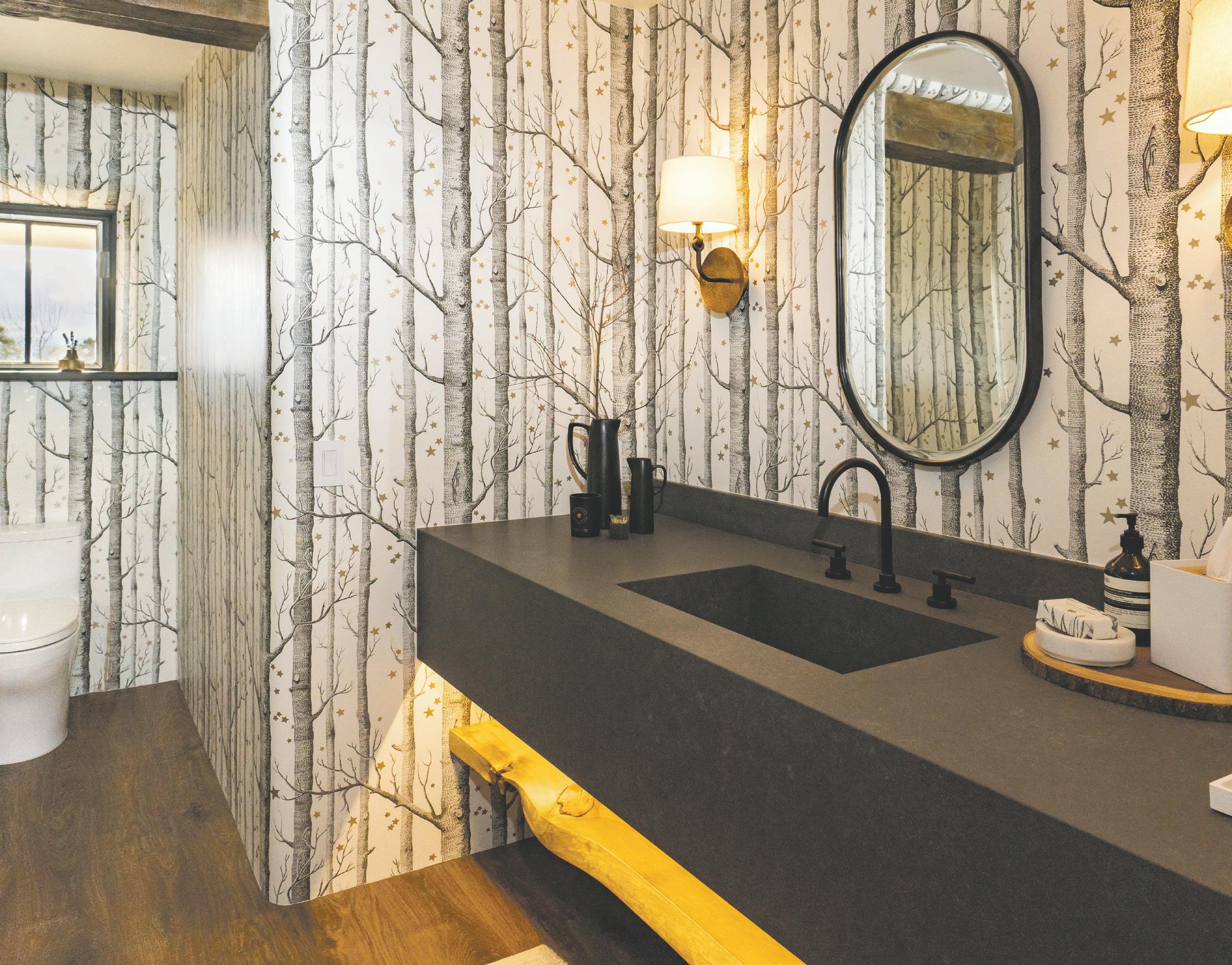 Bathroom finishes such as forest-inspired wallpaper continued the nature-inspired design throughout the home. Mason also