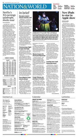 The Santa Fe New Mexican P.O. Box 2048 Santa Fe, NM 87504-2048 Main switchboard: 983-3303 PUBLICATION NO. 596-440 PUBLISHED DAILY AND PERIODICALS POSTAGE PAID AT ONE NEW MEXICAN PLAZA, SANTA FE, NM. POSTMASTER: SEND ALL ADDRESS CHANGES TO CIRCULATION, P.O. BOX 2048, SANTA FE, NM 87504 ©2013 THE SANTA FE NEW MEXICAN ISSN-1938-4068