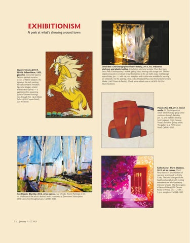 Cheri ibes: Cold Storage (installation detail), 2012, ice, industrial shelving, and plastic bottles. Installation artist and sculptor Cheri Ibes transforms Axle Contemporary’s mobile gallery into a moving cold storage unit. Shelved objects encased in ice slowly reveal themselves as the ice melts away. Cold Storage opens Friday, Jan. 11, with a 6 p.m. reception and is otherwise available for viewing on weekends. For the opening, Axle parks at Railyard Plaza near the Santa Fe Farmers Market (1607 Paseo de Peralta). Check www.axleart.com or call 670-7612 for future locations.