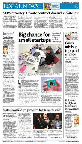 ots of people walk away after a blow to the head with little sign that something serious has happened to their brain. But a nanowire gadget under development at the new BioScience Laboratory in Santa Fe could soon help medical professionals diagnose traumatic brain injuries in less than three minutes with a small blood sample. The mobile diagnostic device developed by the company BioDirection is one of the first startup ventures renting space and sharing lab equipment in a wing of the Santa Fe Business Incubator at 3900 Pueblo del Sol. “This is a very big opportunity for our incubator and for bioscience and biotech businesses,” said business incubator CEO Marie Longserre. “It is the first core shared laboratory available to entrepreneurs in Northern New Mexico. It will reduce their startup costs and let them focus their valuable resources on developing and marketing their companies.” The BioScience Laboratory has a room with state-ofthe-art laboratory equipment such as centrifuges, a tissue hood, an autoclave, a super cold freezer and a machine that amplifies DNA. Each piece of high-tech equipment costs thousands of dollars. That’s not money a startup company like BioDirection can afford and still develop